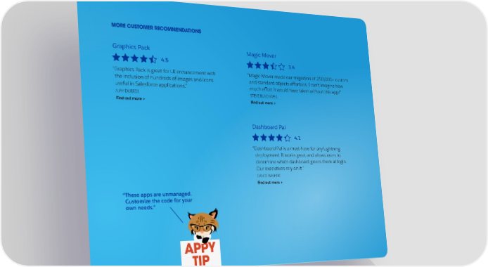 MORE CUSTOMER RECOMMENDATIONS Graphics Pack Magic Mover 4.5 3.4 “ Graphics Pack is great for UI enhancement with “ Magic Mover made our migration of 250,000+ custom the inclusion of hundreds of images and icons and standard objects effortless. I can’t imagine how useful in Salesforce applications.” much effort it would have taken without this app!” AJAY DUBEDI STEVE BLACKWELL Find out more > Find out more > Dashboard Pal 4.1 “Dashboard Pal is a must-have for any Lightning deployment. It works great and allows users to determine which dashboard greets them at login. Our executives rely on it.” CANDI BASHIRI Find out more > “ These apps are unmanaged. Customize the code for your own needs.” APPY TIP