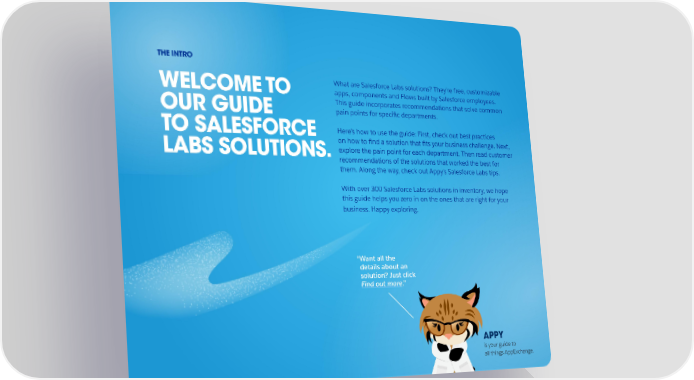 THE INTRO What are Salesforce Labs solutions? They’re free, customizable WELCOME TO apps, components and Flows built by Salesforce employees. This guide incorporates recommendations that solve common OUR GUIDE pain points for specific departments. TO SALESFORCE Here’s how to use the guide: First, check out best practices on how to find a solution that fits your business challenge. Next, LABS SOLUTIONS. explore the pain point for each department. Then read customer recommendations of the solutions that worked the best for them. Along the way, check out Appy’s Salesforce Labs tips. With over 300 Salesforce Labs solutions in inventory, we hope this guide helps you zero in on the ones that are right for your business. Happy exploring. “W ant all the details about an solution? Just click Find out more.” APPY is your guide to all things AppExchange.