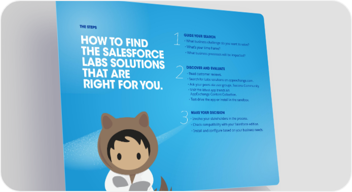 THE STEPS GUIDE YOUR SEARCH 1• What business challenge do you want to solve? HOW TO FIND • What’s your time frame? THE SALESFORCE • What business processes will be impacted? LABS SOLUTIONS DISCOVER AND EVALUATE THAT ARE 2• Read customer reviews. • Search for Labs solutions on appexchange.com. RIGHT FOR YOU. • Ask your peers via user groups, Success Community. • Visit the latest app trends on AppExchange Content Collection. • Test drive the app or install in the sandbox. MAKE YOUR DECISION 3• Involve your stakeholders in the process. • Check compatibility with your Salesforce edition. • Install and configure based on your business needs.