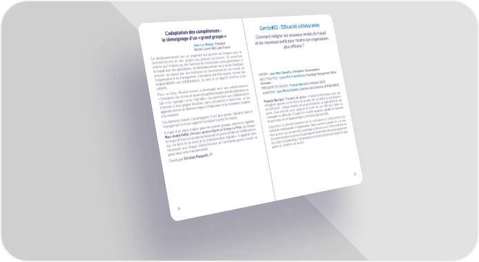 L’adaptation des compétences : Cercle#02 : Efficacité collaborative le témoignage d’un « grand groupe » Comment intégrer les nouveaux modes de travail Jean-Luc Beylat, Président, et les nouveaux outils pour rendre son organisation Alcatel-Lucent Bell Labs France plus efficace ? ˆe décloisonnement est un impératiŠ …ui permet de rompre avec le Šonctionnement en silo, propre aux grosses structures€ ¥n ouverture interne tout d’abord, …ui doit Šavoriser les interactions entre générations et le travail avec les spécialistes€ ¥n décloisonnement vis‘à‘vis de l’extérieur ensuite, …ui passe par une évolution de l’environnement de travail, de l’organisation et du management€ ˆ’entreprise doit être ouverte, donner des responsabilités aux collaborateurs, du sens et un ob•ectiŠ commun à ses ”¸P”T Ž Jean-Marc Tassetto, Cofondateur, Coorpacademy salariés€ ”T Pš‚T™‚” Ž Louis-Pierre Guillaume, Knowledge Management Officer, Pour ce Šaire, šlcatel‘ˆucent a développé avec ses collaborateurs Schneider « l’innovation city » et mis en œuvre des petites é…uipes pluridisciplinaires au PÉ™D”NT D” ÉšN‚” Ž François Barrault, Président, IDATE sein d’un « garage » et de « Šab labs », …ui permettent aux collaborateurs šN™MÉ Pš Ž Jean-Michel Salvator, Directeur de la rédaction, BFM BUSINESS d’innover à leur propre initiative, sans contraintes ni directives, ce …ui apparaît comme un élément ma•eur d’implication et de motivation, propices François Barrault, Président de séance, introduit la thémati…ue avec une à la créativité métaphore sportive sur le thème de la voile, afin de définir la …uintessence ‚es éléments doivent s’accompagner d’une plus grande tolérance dans le de l’eŠficacité Ž cha…ue individu est un proŠessionnel, un spécialiste de son management et d’une capacité à accepter la prise de ris…ues€ poste, mais doté de cette capacité de sortir de son rôle pour aider un ™l s’agit d’un en•eu ma•eur pour les grands groupes comme le rappelle coé…uipier en diŠficulté€ ™l s’agit d’un modèle organisé, capable de Šavoriser Marc-André Feffer, Directeur général Adjoint du Groupe La Poste, …ui évo…ue les principes de compagnonnage et d’initiative personnelle€ le ris…ue de Šracture sociale …ui laisserait un grand nombre de collaborateurs ‚ependant la dématérialisation de la connaissance a bouleversé les sur « le bord de la route de la transŠormation digitale »€ ™l apparaît ainsi schémas traditionnels d’organisation€ Nous sommes passés du « •e sais nécessaire …ue cha…ue métierŸŠonction de l’entreprise puisse trouver sa donc •e suis » au « •e sais donc •e partage et donc •e suis »€ ‚ette évolution de place dans cette transŠormation€ la communication ouverte et du partage de l’inŠormation bouscule également ‚onclu par Christian Pasquetti, EY les codes du leadership, c’est pour…uoi on entend désormais de plus en plus parler d’ « enabler » un succès€ –ƒ –„