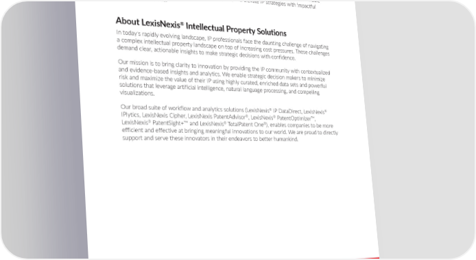 About LexisNexis® PatentSight+™ LexisNexis® PatentSight+™ enables core IP activities such as competitive intelligence and benchmarking, portfolio optimization and more, by bringing together highly curated and enriched datasets, cutting-edge analysis tools with streamlined workflows and powerful visualization capabilities, all within a single platform. With PatentSight+™, enhance decision making with extensive data quality and coverage, provide a competitive edge with actionable insights powered by advanced AI–driven analytics, and elevate IP strategies with impactful communication tools. About LexisNexis® Intellectual Property Solutions In today's rapidly evolving landscape, IP professionals face the daunting challenge of navigating a complex intellectual property landscape on top of increasing cost pressures. These challenges demand clear, actionable insights to make strategic decisions with confidence. Our mission is to bring clarity to innovation by providing the IP community with contextualized and evidence-based insights and analytics. We enable strategic decision makers to minimize risk and maximize the value of their IP using highly curated, enriched data sets and powerful solutions that leverage artificial intelligence, natural language processing, and compelling visualizations. Our broad suite of workflow and analytics solutions (LexisNexis® IP DataDirect, LexisNexis® IPlytics, LexisNexis Cipher, LexisNexis PatentAdvisor®, LexisNexis® PatentOptimizer™, LexisNexis® PatentSight+™ and LexisNexis® TotalPatent One®), enables companies to be more efficient and effective at bringing meaningful innovations to our world. We are proud to directly support and serve these innovators in their endeavors to better humankind. ® To learn more visit us at: LexisNexis Intellectual Property Solutions LexisNexisIP.com Bringing Clarity to Innovation Publication Date: February 2024 LexisNexis, LexisNexis PatentAdvisor, LexisNexis PatentOptimizer, LexisNexis TotalPatent One and the Knowledge Burst logo are registered trademarks of RELX Inc. PatentSight+ is a registered trademark of PatentSight GmbH. IPlytics is a trademark of IPlytics GmbH. Cipher is a trademark of Aistemos Limited. Other products or services may be trademarks or registered trademarks of their respective companies. © LexisNexis 2024.