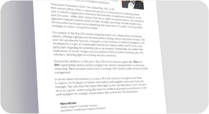 Innova琀椀on Momentum 2024: The Global Top 100 Foreword In the dynamic landscape of modern business, intellectual property (IP) stands as a linchpin, weaving innovation and strategy into the fabric of organizational success. The traditional IP department, once confined to legalities and protection, now extends far beyond safeguarding innovations, actively shaping the trajectory of business endeavors. “Innovation Momentum 2024: The Global Top 100,” in its third annual edition, offers a unique perspective on innovation by analyzing patent data to identify organizations that have demonstrated exceptional momentum in the past two years. Unlike other reports that focus solely on patent volume, the LexisNexis approach evaluates patents based on their strength, providing valuable insights into the innovation landscape and emphasizing the importance of quality-driven portfolio strategies in today’s competitive market. Our analysis of the Top 100 reveals intriguing trends and collaborations among key players, offering a glimpse into the innovations driving various industries forward. This year’s list prominently features companies at the forefront of artificial intelligence (AI) development, a topic of considerable interest and debate within the IP community, particularly regarding AI’s potential role as an inventor. Additionally, we explore the implications of recent mergers and acquisitions (M&A) activities involving select list members, shedding light on evolving industry dynamics. Noteworthy additions to this year’s Top 100 include industry giants like Tesla and IBM, representing diverse sectors ranging from electric transportation to advanced computing. Their inclusion underscores a strategic shift toward quality-driven portfolio management. In an era where information is currency, IP is the essence of progress and there is urgency for IP players to bolster themselves with insightful data and measured foresight. Not only does this report shed light on the top innovators, but it can also serve as a guide, underscoring the need for intellectual property practitioners to be well-equipped for strategic conversations that extend into the boardroom. Marco Richter Global Head of Customer Success LexisNexis® Intellectual Property Solutions In an era where information is currency, intellectual property is the essence of progress. LexisNexisIP.com 2
