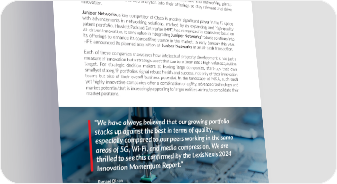 Innova琀椀on Momentum 2024: The Global Top 100 Another similar company in the Top 100 is Splunk, whose expertise in managing and extracting value from vast data troves offers a compelling competitive edge. In today’s data-driven world, their ability to capture, index and analyze large datasets is crucial. With a portfolio of patents that they have been consistently building both in size and quality, as seen by their bubble trajectory, the acquisition move by Cisco underscores the strategic importance of data management capabilities and the strength of Splunk’s portfolio. This also signals a trend where traditional hardware and networking giants are keen to integrate advanced analytics into their offerings to stay relevant and drive innovation. Juniper Networks, a key competitor of Cisco is another significant player in the IT space with advancements in networking solutions, marked by its expanding and high-quality patent portfolio. Hewlett Packard Enterprise (HPE) has recognized its consistent focus on AI–driven innovation. It sees value in integrating Juniper Networks’ robust solutions into its offerings to enhance its competitive stance in the market. In early January this year, HPE announced its planned acquisition of Juniper Networks in an all-cash transaction. Each of these companies showcases how intellectual property development is not just a measure of innovation but a strategic asset that can turn them into a high-value acquisition target. For strategic decision makers at leading large companies, start-ups that own smallyet strong IP portfolios signal robust health and success, not only of their innovation teams but also of their overall business potential. In the landscape of M&A, such small yet highly innovative companies offer a combination of agility, advanced technology and market potential that is increasingly appealing to larger entities aiming to consolidate their market positions. “We have always believed that our growing portfolio stacks up against the best in terms of quality, especially compared to our peers working in the same areas of 5G, Wi-Fi, and media compression. We are thrilled to see this confirmed by the LexisNexis 2024 Innovation Momentum Report.” Esmael Dinan Founder and CTO Ofinno LLeexisxisNNeexisxisIPIP.c.comom 1818