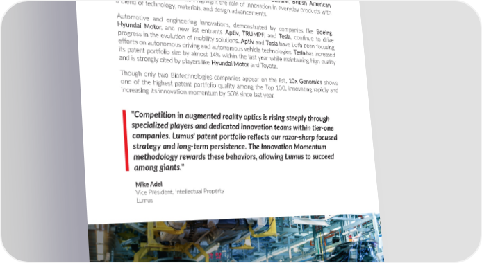 Innova琀椀on Momentum 2024: The Global Top 100 Tech giants, including Alphabet, Amazon, and Apple, representing the U.S. as an Information Technologies hub, also extend their influence into biotechnologies, medical technologies, and consumer goods, showcasing their multifaceted role in innovation. IBM, appearing on the list for the first time, announced in 2022 that they were shifting to a more focused patent strategy, most likely playing a role in their momentum this year. Diverse consumer goods companies like Nike, Proctor & Gamble, British American Tobacco, and CJ Corporation highlight the role of innovation in everyday products with a blend of technology, materials, and design advancements. Automotive and engineering innovations, demonstrated by companies like Boeing, Hyundai Motor, and new list entrants Aptiv, TRUMPF, and Tesla, continue to drive progress in the evolution of mobility solutions. Aptiv and Tesla have both been focusing efforts on autonomous driving and autonomous vehicle technologies. Tesla has increased its patent portfolio size by almost 14% within the last year while maintaining high quality and is strongly cited by players like Hyundai Motor and Toyota. Though only two Biotechnologies companies appear on the list, 10x Genomics shows one of the highest patent portfolio quality among the Top 100, innovating rapidly and increasing its innovation momentum by 50% since last year. "Competition in augmented reality optics is rising steeply through specialized players and dedicated innovation teams within tier-one companies. Lumus' patent portfolio reflects our razor-sharp focused strategy and long-term persistence. The Innovation Momentum methodology rewards these behaviors, allowing Lumus to succeed among giants." Mike Adel Vice President, Intellectual Property Lumus LLeexisxisNNeexisxisIPIP.c.comom 141414