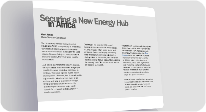Securing a New Energy Hub in Africa West Africa Chain Stopper Operations The permanently moored floating liquefied Challenge: The project’s FLNG vessel’s Solution: Early engagement in the project’s natural gas (FLNG) storage facility in West Africa mooring devices needed to be able to operate design phase enabled Trelleborg to provide experiences similar long-period, infra-gravity in up to 10,000yr return period design wind solutions to the FLNG mooring application waves within the harbor, as act upon the LNGC conditions. This meant keeping the mooring challenges. A bespoke adjustable Chain vessels. However, being moored continually in lines in tension would require adjusting the Stopper device was developed to provide the same location, the FLNG vessel must be chain portions of the mooring lines link-by-link adjustment to chain tension by as little more durable. and then locking them in place while monitoring as 200mm using multiple jaws and a the mooring loads. This process would need to safe working load of 250T together with As a crucial element to the project’s success, be repeated as required. load monitoring. Additional features were the FLNG vessel must be moored as rigidly as developed for units specific to the project possible to enable production operations to to assist in hazardous areas operation continue. This would typically involve anchor compliance, extra dynamic adjustment chain systems – however, that does not enable range, and system redundancy. adjustment to allow for vessel sway, surge motions and tidal or loading draft changes. The FLNG vessel benefited from a reduction Scan the QR code Unplanned vessel excursions caused by in mooring line loads and vessel movement, Providing solutions that can operate in up to 10,000yr using the Marine and line breakages can cause major safety an improvement in mooring line safety return period design wind conditions, Trelleborg is Infrastructure AR App hazards for personnel and disrupt product zones, and sustainable and continuous to explore Chain Stopper transfer operations. product transfers. securing the terminal’s FLNG vessel with the flexibility in more detail. harsh environments require.