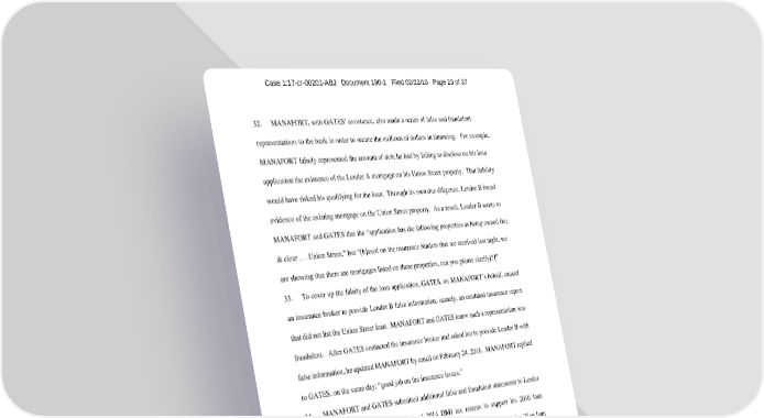 Case 1:17-cr-00201-ABJ Document 190-1 Filed 02/22/18 Page 23 of 37 32. MANAFORT, with GATES’ assistance, also made a series of false and fraudulent representations to the bank in order to secure the millions of dollars in financing. For example, MANAFORT falsely represented the amount of debt he had by failing to disclose on his loan application the existence of the Lender A mortgage on his Union Street property. That liability would have risked his qualifying for the loan. Through its own due diligence, Lender B found evidence of the existing mortgage on the Union Street property. As a result, Lender B wrote to MANAFORT and GATES that the “application has the following properties as being owned free & clear . . . Union Street,” but “[b]ased on the insurance binders that we received last night, we are showing that there are mortgages listed on these properties, can you please clarify[?]” 33. To cover up the falsity of the loan application, GATES, on MANAFORT’s behalf, caused an insurance broker to provide Lender B false information, namely, an outdated insurance report that did not list the Union Street loan. MANAFORT and GATES knew such a representation was fraudulent. After GATES contacted the insurance broker and asked her to provide Lender B with false information, he updated MANAFORT by email on February 24, 2016. MANAFORT replied to GATES, on the same day: “good job on the insurance issues.” 34. MANAFORT and GATES submitted additional false and fraudulent statements to Lender B. For example, MANAFORT submitted 2014 DMI tax returns to support his 2016 loan application to Lender B. Those tax returns included as a purported liability a $1.5 million loan from Peranova. Peranova was a Cypriot entity controlled by MANAFORT and GATES. On or about February 1, 2012, Peranova transferred $1.5 million to a DMI account in the United States, denominating the transfer as a loan so that MANAFORT would not have to declare the money as income. MANAFORT used the “loan” to acquire the Howard Street property. 35. When MANAFORT needed to obtain a loan from Lender B, the existence of the Peranova 23