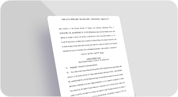 Case 1:17-cr-00201-ABJ Document 190-1 Filed 02/22/18 Page 32 of 37 and inclusive, in the Eastern District of Virginia and elsewhere, defendants PAUL J. MANAFORT, JR., and RICHARD W. GATES III did knowingly and intentionally execute and attempt to execute a scheme and artifice to defraud one or more financial institutions, to wit: Lender B, the deposits of which were insured by the Federal Deposit Insurance Corporation, and to obtain moneys, funds, and credits owned by and under the custody and control of such financial institution by means of materially false and fraudulent pretenses, representations, and promises. (18 U.S.C. §§ 1344, 2, and 3551 et seq.) COUNT TWENTY-SIX (Bank Fraud Conspiracy / Lender C / $1 million loan) 61. Paragraphs 1 through 44 are incorporated here. 62. On or about and between March 2016 and May 2016, both dates being approximate and inclusive, in the Eastern District of Virginia and elsewhere, defendants PAUL J. MANAFORT, JR., and RICHARD W. GATES III did knowingly and intentionally conspire to execute a scheme and artifice to defraud one or more financial institutions, to wit: Lender C, the deposits of which were insured by the Federal Deposit Insurance Corporation, and to obtain moneys, funds, and credits owned by and under the custody and control of such financial institution by means of materially false and fraudulent pretenses, representations, and promises, contrary to Title 18, United States Code, Section 1344. (18 U.S.C. §§ 1349 and 3551 et seq.) COUNT TWENTY-SEVEN (Bank Fraud / Lender C / $1 million loan) 63. Paragraphs 1 through 44 are incorporated here. 64. On or about and between December 2015 and March 2016, both dates being approximate and inclusive, in the Eastern District of Virginia and elsewhere, defendants PAUL J. 32
