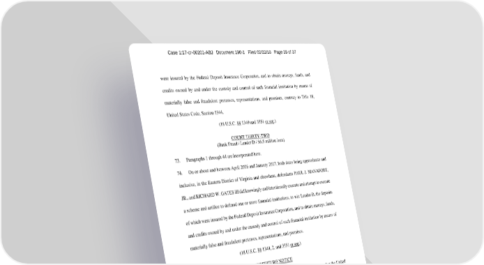 Case 1:17-cr-00201-ABJ Document 190-1 Filed 02/22/18 Page 35 of 37 were insured by the Federal Deposit Insurance Corporation, and to obtain moneys, funds, and credits owned by and under the custody and control of such financial institution by means of materially false and fraudulent pretenses, representations, and promises, contrary to Title 18, United States Code, Section 1344. (18 U.S.C. §§ 1349 and 3551 et seq.) COUNT THIRTY-TWO (Bank Fraud / Lender D / $6.5 million loan) 73. Paragraphs 1 through 44 are incorporated here. 74. On or about and between April 2016 and January 2017, both dates being approximate and inclusive, in the Eastern District of Virginia and elsewhere, defendants PAUL J. MANAFORT, JR., and RICHARD W. GATES III did knowingly and intentionally execute and attempt to execute a scheme and artifice to defraud one or more financial institutions, to wit: Lender D, the deposits of which were insured by the Federal Deposit Insurance Corporation, and to obtain moneys, funds, and credits owned by and under the custody and control of such financial institution by means of materially false and fraudulent pretenses, representations, and promises. (18 U.S.C. §§ 1344, 2, and 3551 et seq.) FORFEITURE NOTICE 75. Pursuant to Fed. R. Crim. P. 32.2, notice is hereby given to the defendants that the United States will seek forfeiture as part of any sentence in accordance with Title 18, United States Code, Section 982(a)(2), in the event of the defendants’ convictions under Counts Twenty-Four through Thirty-Two of this Superseding Indictment. Upon conviction of the offenses charged in Counts Twenty-Four through Thirty-Two, defendants PAUL J. MANAFORT, JR., and RICHARD W. GATES III shall forfeit to the United States any property constituting, or derived from, proceeds 35