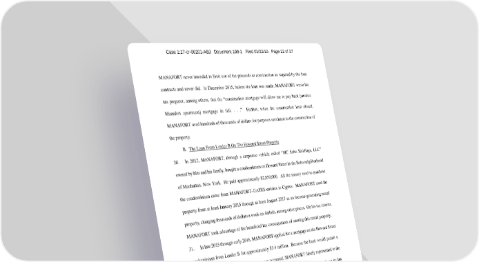 Case 1:17-cr-00201-ABJ Document 190-1 Filed 02/22/18 Page 22 of 37 MANAFORT never intended to limit use of the proceeds to construction as required by the loan contracts and never did. In December 2015, before the loan was made, MANAFORT wrote his tax preparer, among others, that the “construction mortgage will allow me to pay back [another Manafort apartment] mortgage in full. . . .” Further, when the construction loan closed, MANAFORT used hundreds of thousands of dollars for purposes unrelated to the construction of the property. B. The Loan From Lender B On The Howard Street Property 30. In 2012, MANAFORT, through a corporate vehicle called “MC Soho Holdings, LLC” owned by him and his family, bought a condominium on Howard Street in the Soho neighborhood of Manhattan, New York. He paid approximately $2,850,000. All the money used to purchase the condominium came from MANAFORT–GATES entities in Cyprus. MANAFORT used the property from at least January 2015 through at least August 2017 as an income-generating rental property, charging thousands of dollars a week on Airbnb, among other places. On his tax returns, MANAFORT took advantage of the beneficial tax consequences of owning this rental property. 31. In late 2015 through early 2016, MANAFORT applied for a mortgage on the Howard Street condominium from Lender B for approximately $3.4 million. Because the bank would permit a greater loan amount if the property were owner-occupied, MANAFORT falsely represented to the lender and its agents that it was a secondary home used as such by his daughter and son-in-law and was not held as a rental property. In an email on January 6, 2016, MANAFORT noted: “[i]n order to have the maximum benefit, I am claiming Howard St. as a second home. Not an investment property.” Later, on January 26, 2016, MANAFORT wrote to his son-in-law to advise him that when the bank appraiser came to assess the condominium, his son-in-law should “[r]emember, he believes that you and [MANAFORT’s daughter] are living there.” 22