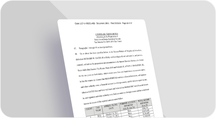 Case 1:17-cr-00201-ABJ Document 190-1 Filed 02/22/18 Page 28 of 37 COUNTS SIX THROUGH TEN (Assisting in the Preparation of False United States Individual Income Tax Returns For 2010–2014 Tax Years) 47. Paragraphs 1 through 44 are incorporated here. 48. On or about the dates specified below, in the Eastern District of Virginia and elsewhere, defendant RICHARD W. GATES III willfully and knowingly did aid and assist in, and procure, counsel, and advise the preparation and presentation to the Internal Revenue Service, of a United States Individual Income Tax Return, Form 1040 and Schedule B, of PAUL J. MANAFORT, JR., for the tax years set forth below, which returns were false and fraudulent as to a material matter, in that the returns (a) claimed that MANAFORT did not have a financial interest in, and signature and other authority over, a financial account in a foreign country and (b) failed to report income, whereas GATES then and there well knew and believed that MANAFORT had a financial interest in, and signature and other authority over, bank accounts in a foreign country and had earned total income in excess of the reported amounts noted below: COUNT TAX APPROX. FILING FOREIGN ACCOUNT TOTAL INCOME YEAR DATE REPORTED REPORTED (Sch. B, Line 7a) (Line 22) 6 2010 October 14, 2011 None $504,744 7 2011 October 15, 2012 None $3,071,409 8 2012 October 7, 2013 None $5,361,007 9 2013 October 6, 2014 None $1,910,928 10 2014 October 14, 2015 None $2,984,210 (26 U.S.C. § 7206(2); 18 U.S.C. § 3551 et seq.) COUNTS ELEVEN THROUGH FOURTEEN (Failure To File Reports Of Foreign Bank And Financial Accounts For Calendar Years 2011–2014) 49. Paragraphs 1 through 44 are incorporated here. 50. On the filing due dates listed below, in the Eastern District of Virginia and elsewhere, 28
