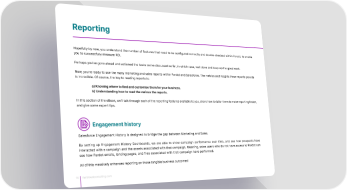 Reporting Hopefully by now, you understand the number of features that need to be configured correctly and double-checked within Pardot, to enable you to successfully measure ROI. Perhaps you’ve gone ahead and actioned the tasks we’ve discussed so far, in which case, well done and keep up the good work. Now, you’re ready to use the many marketing and sales reports within Pardot and Salesforce. The metrics and insights these reports provide is incredible. Of course, the key to reading reports is: a) Knowing where to find and customise them for your business. b)Understanding how to read the various the reports. In this section of the eBook, we’ll talk through each of the reporting features available to you, share how to tailor them to make reporting faster, and give some expert tips. Engagement history Salesforce Engagement History is designed to bridge the gap between Marketing and Sales. By setting up Engagement History Dashboards, we are able to show campaign performance over time, and see how prospects have interacted with a campaign and the assets associated with that campaign. Meaning, sales users who do not have access to Pardot can see how Pardot emails, landing pages, and files associated with that campaign have performed. All of this massively enhances reporting on those tangible business outcomes! 16 marcloudconsulting.com