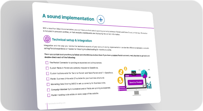A sound implementation With a less than ideal implementation, you can’t be sure that data is syncing correctly between Pardot and Sales Cloud, or that key information is included in prospect profiles, or that analytics dashboards are displaying the correct information. Technical setup & integration Integration and the way you handle the technical aspects of your account during implementation can be the difference between a smooth sailing Pardot experience or headache-inducing troubleshooting for months to come. There are certain best practices to follow and checkboxes to tick. Even if you have a mature Pardot account, now’s the time to go back and double-check each of the following: • The Pardot Connector is syncing as expected and without errors. • Custom fields in Pardot are correctly mapped to Salesforce. • Custom buttons exist for ‘Send to Pardot’ and ‘Send Pardot email’ in Salesforce. • Pardot Business Units exist (if suitable for your business structure). • Marketing Data Sharing (MDS) is set up correctly for Business Units. Send to Pardot • Campaign Member Sync is enabled and all fields are syncing as expected. • Pardot tracking code exists on every page of the website. 6 marcloudconsulting.com