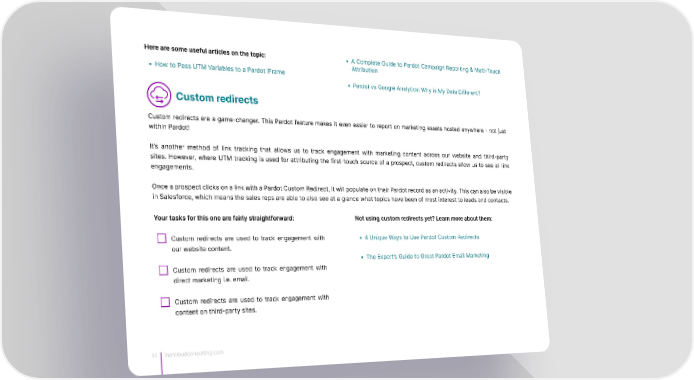 Here are some useful articles on the topic: • A Complete Guide to Pardot Campaign Reporting & Multi-Touch Attribution • How to Pass UTM Variables to a Pardot iFrame • Pardot vs Google Analytics: Why is My Data Different? Custom redirects Custom redirects are a game-changer. This Pardot feature makes it even easier to report on marketing assets hosted anywhere - not just within Pardot! It’s another method of link tracking that allows us to track engagement with marketing content across our website and third-party sites. However, where UTM tracking is used for attributing the first-touch source of a prospect, custom redirects allow us to see all link engagements. Once a prospect clicks on a link with a Pardot Custom Redirect, it will populate on their Pardot record as an activity. This can also be visible in Salesforce, which means the sales reps are able to also see at a glance what topics have been of most interest to leads and contacts. Your tasks for this one are fairly straightforward: Not using custom redirects yet? Learn more about them: • Custom redirects are used to track engagement with • 4 Unique Ways to Use Pardot Custom Redirects our website content. • The Expert’s Guide to Great Pardot Email Marketing • Custom redirects are used to track engagement with direct marketing i.e. email. • Custom redirects are used to track engagement with content on third-party sites. 14 marcloudconsulting.com