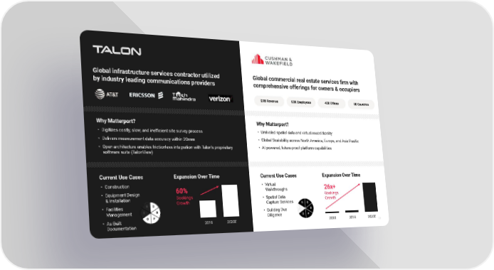 13 Global infrastructure services contractor utilized by industry leading communications providers Global commercial real estate services firm with comprehensive offerings for owners & occupiers $9B Revenue 53K Employees 400 Offices 60 Countries Why Matterport? Unrivaled spatial data and virtual model fidelity Global Scalability across North America, Europe, and Asia Pacific AI powered, future-proof platform capabilities Why Matterport? Digitizes costly, slow, and inefficient site survey process Delivers measurement data accuracy within 20mm Open architecture enables frictionless integration with Talons proprietary software suite (TalonView) Current Use Cases Construction Equipment Design & Installation Facilities Management As Built Documentation Expansion Over Time Current Use Cases Virtual Walkthroughs Spatial Data Capture Services Building Due Diligence 2019 2020E 60% Bookings Growth Expansion Over Time 2018 2019 2020E 26x+ Bookings Growth