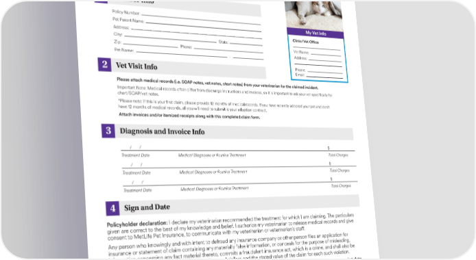 Claim Form All claims must be submitted in writing within ninety (90) days of the treatment or receipt date. 1 Member Info Policy Number: Pet Parent Name: My Vet Info Address: Clinic/Vet O昀케ce City: State: Zip: Phone: Vet Name: Pet Name: - Address: Phone: 2 Vet Visit Info Email: Please attach medical records (i.e. SOAP notes, vet notes, chart notes) from your veterinarian for the claimed incident. Important Note: Medical records often di昀昀er from discharge instructions and invoices, so it is important to ask your vet speci昀椀cally for chart/SOAP/vet notes. *Please note: if this is your 昀椀rst claim, please provide 12 months of medical records. If you have recently adopted your pet and don’t have 12 months of medical records, all you will need to submit is your adoption contract. Attach invoices and/or itemized receipts along with this completed claim form. 3 Diagnosis and Invoice Info / / $ Treatment Date Medical Diagnoses or Routine Treatment Total Charges / / $ Treatment Date Medical Diagnoses or Routine Treatment Total Charges / / $ Treatment Date Medical Diagnoses or Routine Treatment Total Charges 4 Sign and Date Policyholder declaration: I declare my veterinarian recommended the treatment for which I am claiming. The particulars given are correct to the best of my knowledge and belief. I authorize my veterinarian to release medical records and give consent to MetLife Pet Insurance, to communicate with my veterinarian or veterinarian’s sta昀昀. Any person who knowingly and with intent to defraud any insurance company or other person 昀椀les an application for insurance or statement of claim containing any materially false information, or conceals for the purpose of misleading, information concerning any fact material thereto, commits a fraudulent insurance act, which is a crime, and shall also be subject to a civil penalty not to exceed 昀椀ve thousand dollars and the stated value of the claim for each such violation. All claims must be submitted in writing to MetLife Pet Insurance within ninety (90) days of the treatment or receipt date. Please allow at least 10 business days for processing. Incomplete forms will delay claims processing. Signature: Date: Submit Your Claim MAIL TO: MetLife Pet Insurance - EMAIL TO: FAX TO: UPLOAD TO: Claims Department, Pet_Submit_Claim@metlife.com 877-281-3348 Our Mobile App or 400 Missouri Avenue, Suite 105, MyPets Online Account Jeffersonville, IN 47130 © 2022 MetLife Services and Solutions, LLC, New York, NY 10166 - All Rights Reserved.