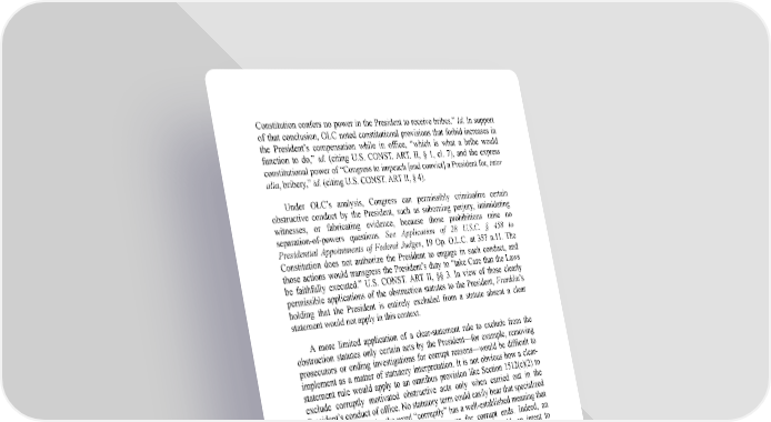 Constitution confers no power in the President to receive bribes.” Id. In support of that conclusion, OLC noted constitutional provisions that forbid increases in the President’s compensation while in office, “which is what a bribe would function to do,” id. (citing U.S. CONST. ART. II, § 1, cl. 7), and the express constitutional power of “Congress to impeach [and convict] a President for, inter alia, bribery,” id. (citing U.S. CONST. ART II, § 4). Under OLC’s analysis, Congress can permissibly criminalize certain obstructive conduct by the President, such as suborning perjury, intimidating witnesses, or fabricating evidence, because those prohibitions raise no separation-of-powers questions. See Application of 28 U.S.C. § 458 to Presidential Appointments of Federal Judges, 19 Op. O.L.C. at 357 n.11. The Constitution does not authorize the President to engage in such conduct, and those actions would transgress the President’s duty to “take Care that the Laws be faithfully executed.” U.S. CONST. ART II, §§ 3. In view of those clearly permissible applications of the obstruction statutes to the President, Franklin’s holding that the President is entirely excluded from a statute absent a clear statement would not apply in this context. A more limited application of a clear-statement rule to exclude from the obstruction statutes only certain acts by the President—for example, removing prosecutors or ending investigations for corrupt reasons—would be difficult to implement as a matter of statutory interpretation. It is not obvious how a clear- statement rule would apply to an omnibus provision like Section 1512(c)(2) to exclude corruptly motivated obstructive acts only when carried out in the President’s conduct of office. No statutory term could easily bear that specialized meaning. For example, the word “corruptly” has a well-established meaning that does not exclude exercises of official power for corrupt ends. Indeed, an established definition states that “corruptly” means action with an intent to secure an improper advantage “inconsistent with official duty and the rights of others.” BALLENTINE’S LAW DICTIONARY 276 (3d ed. 1969) (emphasis added). And it would be contrary to ordinary rules of statutory construction to adopt an unconventional meaning of a statutory term only when applied to the President. See United States v. Santos, 553 U.S. 507, 522 (2008) (plurality opinion of Scalia, J.) (rejecting proposal to “giv[e] the same word, in the same statutory provision, different meanings in different factual contexts”); cf. Public Citizen, 491 U.S. at 462-467 (giving the term “utilized” in the FACA a uniform meaning to avoid constitutional questions). Nor could such an exclusion draw on