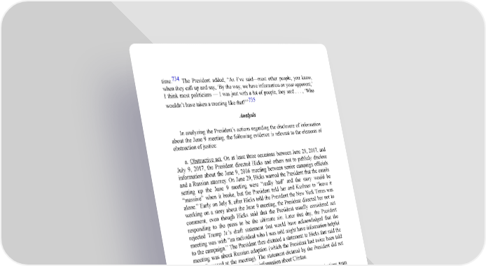 734 time. The President added, “As I’ve said—most other people, you know, when they call up and say, ‘By the way, we have information on your opponent,’ I think most politicians — I was just with a lot of people, they said . . . , ‘Who 735 wouldn’t have taken a meeting like that?”’ Analysis In analyzing the President’s actions regarding the disclosure of information about the June 9 meeting, the following evidence is relevant to the elements of obstruction of justice: a. Obstructive act. On at least three occasions between June 29, 2017, and July 9, 2017, the President directed Hicks and others not to publicly disclose information about the June 9, 2016 meeting between senior campaign officials and a Russian attorney. On June 29, Hicks warned the President that the emails setting up the June 9 meeting were “really bad” and the story would be “massive” when it broke, but the President told her and Kushner to “leave it alone.” Early on July 8, after Hicks told the President the New York Times was working on a story about the June 9 meeting, the President directed her not to comment, even though Hicks said that the President usually considered not responding to the press to be the ultimate sin. Later that day, the President rejected Trump Jr.’s draft statement that would have acknowledged that the meeting was with “an individual who I was told might have information helpful to the campaign.” The President then dictated a statement to Hicks that said the meeting was about Russian adoption (which the President had twice been told was discussed at the meeting). The statement dictated by the President did not mention the offer of derogatory information about Clinton. Each of these efforts by the President involved his communications team and was directed at the press. They would amount to obstructive acts only if the President, by taking these actions, sought to withhold information from or mislead congressional investigators or the Special Counsel. On May 17, 2017, the President’s campaign received a document request from SSCI that clearly covered the June 9 meeting and underlying emails, and those documents also plainly would have been relevant to the Special Counsel’s investigation. But the evidence does not establish that the President took steps to prevent the emails or other information about the June 9 meeting from being provided to Congress or the Special Counsel. The series of discussions in which the