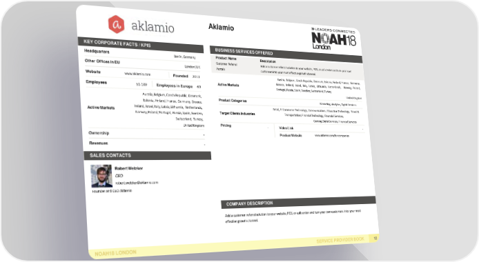 Aklamio KEY CORPORATE FACTS /KPIS BUSINESS SERVICESOFFERED Headquarters Berlin,Germany Product Name Description Customer Referral Add a customer referral solution to your website, POS, or call center and turn your own Other Offices inEU London|UK Portals customers into your most effective growthchannel. Website www.aklamio.com Founded 2011 Austria, Belgium, Czech Republic, Denmark, Estonia, Finland, France, Germany, Active Markets Greece, Ireland, Israel, Italy, Latvia, Lithuania, Netherlands, Norway, Poland, Employees 51-100 EmployeesinEurope 60 Portugal,Russia, Spain,Sweden,Switzerland,Turkey, UnitedKingdom Austria, Belgium, Czech Republic, Denmark, ProductCategories Estonia, Finland, France, Germany,Greece, Marketing, Analytics, Digital Services ActiveMarkets Ireland, Israel, Italy, Latvia,Lithuania, Netherlands, Retail, E-Commerce Technology, Communications, Education Technology, Travel & Norway,Poland,Portugal, Russia, Spain, Sweden, Target ClientsIndustries Transportation, Financial Technology, Financial Services, Switzerland, Turkey, Gaming, Digital Services, Financial Services UnitedKingdom Pricing - VideoLink - Ownership - ProductWebsite www.aklamio.com/for-companies Revenues - SALESCONTACTS RobertWetzker CEO robert.wetzker@aklamio.com Founder and CEO Aklamio COMPANYDESCRIPTION Add a customer referral solution to your website, POS, or call center and turn your own customers into your most effective growthchannel. NOAH18LONDON SERVICE PROVIDERBOOK 12