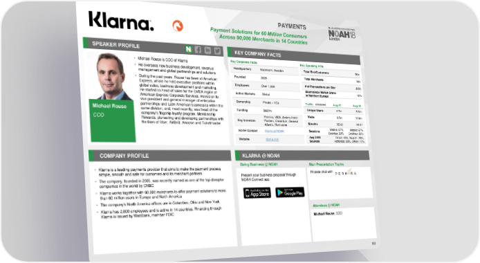 PAYMENTS Payment Solutions for 60 Million Consumers Across 90,000 Merchants in 14 Countries SPEAKER PROFILE KEY COMPANY FACTS • Michael Rouse is CCO of Klarna Key Corporate Facts Key Operating KPIs • He oversees new business development, revenue Headquarters Stockholm, Sweden Total End-Customers 60m management and global partnerships and solutions Founded 2005 Total Merchants 90k • During the past years, Rouse has been at American # of Transactions per Day 800k Express, where he held executive positions within Employees Over 1,000 global sales, business development and marketing. EcommerceMarket Share 10% He started as head of sales for the EMEA region at Active Markets Global in Northern Europe American Express Corporate Services, moved on to vice president and general manager of enterprise Ownership Private – VCs Traffic Aug-17 Aug-18 partnerships and Latin American businesses within the Unique Users 4.7m 5.3m Michael Rouse same division, and, most recently, was head of the Funding $662m company’s flagship loyalty program, Membership Permira, VISA, Anders Holch Visits 9.5m 10.9m CCO Rewards, pioneering and developing partnerships with Key Investors Povlsen, Creandum, General the likes of Uber, AirBnB, Amazon and Ticketmaster Atlantic, Northzone Minutes 02:50 02:47 NOAHContent Klarna at NOAH Sessions Mobile: 67% Mobile: 67% Desktop: 33% Desktop: 33% Website klarna.com Aug 2018 Direct: 43%, Search: 20%, Sources Referrals: 20%, Other: 17% COMPANY PROFILE KLARNA @ NOAH Doing Business @ NOAH Main Presentation Topics • Klarna is a leading payments provider that aims to make the payment process simple, smooth and safe for customers and its merchant partners Present your business proposal through Fireside chat with • The company, founded in 2005, was recently named as one of the top disruptor NOAH Connect app companies in the world by CNBC • Klarna works together with 90,000 merchants to offer payment solutions to more than 60 million users in Europe and North America • The company’s North America offices are in Columbus, Ohio and New York. • Klarna has 2,000 employees and is active in 14 countries. Financing through Attendees @NOAH Klarna is issued by WebBank, member FDIC Michael Rouse, CCO 68