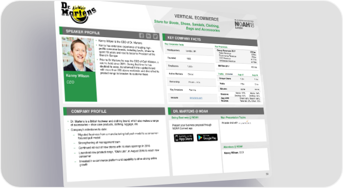 VERTICAL ECOMMERCE Store for Boots, Shoes, Sandals, Clothing, Bagsand Accessories SPEAKER PROFILE KEY COMPANY FACTS • Kenny Wilson is the CEO of Dr. Martens Key Corporate Facts Key Financials • Kenny has extensive experience of leading high- Group Revenues 2017 £291m Headquarters London, UK Retail Revenue £79m profile consumer brands, including Levi’s, where he Ecommerce Revenue £32m spent 19 years and rose to become President of the DTC Revenue £111m Brand in Europe Founded 1995 Wholesale Revenue £179m • Prior to Dr Martens he was the CEO of Cath Kidston, a EBITDA 2017 £37.5m role he held since 2011. During that time he has Employees 1,000+ doubled its sales, transformed it into a global brand with more than 220 stores worldwide and diversified its Active Markets Global Traffic Aug-17 Aug-18 Kenny Wilson product range to broaden its customer base Unique Users 1.2m 1.4m Ownership Private – VCs Visits 2.6m 3.1m CEO Key Investors Permira Minutes 03:49 03:58 Sessions Mobile: 55% Mobile: 54% Desktop: 45% Desktop: 46% Website drmartens.com Aug 2018 Direct: 22%, Search: 66%, Sources Referrals: 2%, Other: 10% COMPANY PROFILE DR. MARTENS @ NOAH Doing Business @ NOAH Main Presentation Topics • Dr. Martens is a British footwear and clothing brand, which also makes a range of accessories – shoe care products, clothing, luggage, etc Present your business proposal through Fireside chat with • Company’s milestones to date: NOAH Connect app – Migrated business from a manufacturing-led push model to a consumer- focused pull model – Strengthening of management team – Continued roll-out of new stores with 16 store openings in 2016 – Launched new product range, “DM’s Lite”, in August 2016 to reach new Attendees @NOAH consumer Kenny Wilson,CEO – Invested in e-commerce platform and capability to drive strong online growth 39
