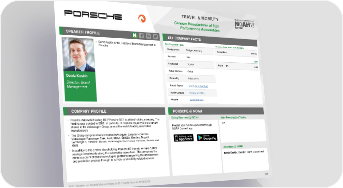 TRAVEL & MOBILITY German Manufacturer of High PerformanceAutomobiles SPEAKER PROFILE KEY COMPANY FACTS • Deniz Keskin is the Director of Brand Management in Key Corporate Facts Valuation Data and Key Financials Porsche Headquarters Stuttgart, Germany Market Cap €17.3bn Founded 1931 2017 Employees 10,000+ Profit €m 3,332 Active Markets Global Deniz Keskin Ownership Public (ETR) Director, Brand Annual Report Click here to download Management NOAHContent Porsche at NOAH Website porsche-se.com COMPANY PROFILE PORSCHE @ NOAH • Porsche Automobil Holding SE ("Porsche SE") is a listed holding company. The Doing Business @ NOAH Main Presentation Topics holding was founded in 2007. In particular, it holds the majority of the ordinary N/A shares in the Volkswagen Group, one of the world's leading automobile Present your business proposal through manufacturers NOAH Connect app • The Group comprises twelve brands from seven European countries: Volkswagen Passenger Cars, Audi, SEAT, ŠKODA, Bentley, Bugatti, Lamborghini, Porsche, Ducati, Volkswagen Commercial Vehicles, Scania and MAN • In addition to this anchor shareholding, Porsche SE intends to make further Attendees @NOAH strategic investments along the automotive value chain. This comprises the entire spectrum of basic technologies geared to supporting the development Deniz Keskin, Director, Brand Management and production process through to vehicle- and mobility-related services Note: Valuation and financial data according to S&P Capital IQ (as of 25/09/2018). 105