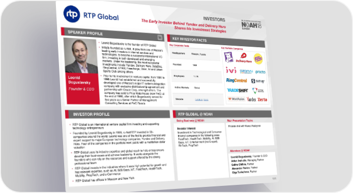 INVESTORS The Early Investor Behind Yandex and Delivery Hero Shares his Investment Strategies SPEAKER PROFILE KEY INVESTORFACTS • Leonid Boguslavsky is the founder of RTP Global Key Corporate Facts Key Portfolio Companies • Initially founded as ru-Net , it grew from one of Russia’s Headquarters Moscow, Russia leading early investors in internet services and technologies, to become a successful international VC firm, investing in both developed and emerging markets. Under his leadership, the most successful Founded 1999 investments include Yandex, Delivery Hero, DataDog, RingCentral, EPAM, Freecharge, Ozon, Ivi and Urban Sports Club among others Employees 11-25 Leonid • Prior to his involvement in venture capital, from 1990 to 1996 Leonid had established and successfully Boguslavsky developed one of Russia’s major IT systems integration company with exclusive distributorship agreement and Active Markets Global partnership with Oracle Corp, amongst others. The Founder & CEO company was sold to Price Waterhouse (now PwC) at the end of 1996, after which Boguslavsky served for Website ru-net.ru; rtp.vc five years as a Senior Partner of Management Consulting Services at PwC Russia INVESTORPROFILE RTP GLOBAL @ NOAH Doing Business @ NOAH Main Presentation Topics • RTP Global is an international venture capital firm investing and supporting technology entrepreneurs Investor Interest Fireside chat with Marco Rodzynek • Founded by Leonid Boguslavsky in 1999, ru-Net/RTP invested in 50+ Investment in Technological and Consumer companies around the world. Leonid was one of the first to provide financial and Internet companies in the following areas expert support to major European technology companies, Yandex and Delivery FoodTech, HealthTech, Mobility, AI, B2B Hero. Four of the companies in the portfolio went public with a multibillion-dollar Saas, IoT, Entertainment (incl E-sport), valuation FinTech, PropTech • RTP Global uses its industry expertise and global reach to help entrepreneurs develop their businesses and achieve leadership. It works alongside the Attendees @NOAH founders who can rely on the resources and support offered by the strong professional team Leonid Boguslavsky, Founder & CEO • RTP Global invests in the industries where it sees high potential for growth and Anton Inshutin, Managing Partner has relevant expertise, such as AI, B2B Saas, IoT, FoodTech, HealthTech, Galina Chifina, Partner Mobility, PropTech, and e-Commerce Alexander Pavlov, Partner • RTP Global has offices in Moscow and New York Olga Turischeva, Partner 111