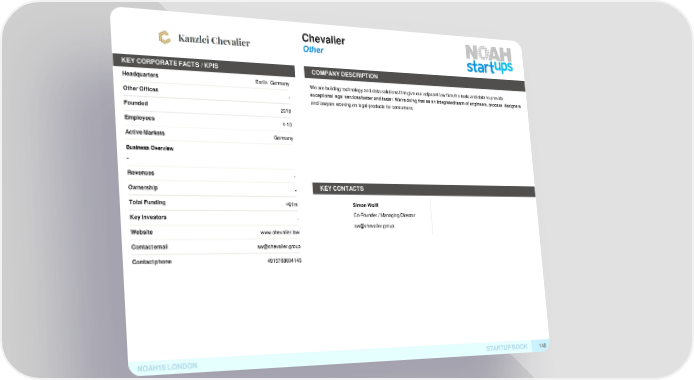 Chevalier Other KEY CORPORATE FACTS /KPIS COMPANYDESCRIPTION Headquarters Berlin, GermanyWe are building technology and data solutions that give our adjacent law firm the tools and data to provide OtherOffices - exceptional legal services better and faster. We're doing that as an integrated team of engineers, process designers and lawyers working on legal products for consumers. Founded 2018 Employees 4-10 ActiveMarkets Germany Business Overview - Revenues - Ownership - KEYCONTACTS TotalFunding <€1m Simon Wolff KeyInvestors - Co-Founder / Managing Director Website [email protected] www.chevalier.law Contactemail [email protected] Contactphone 4915788604146 NOAH18LONDON STARTUPBOOK 140