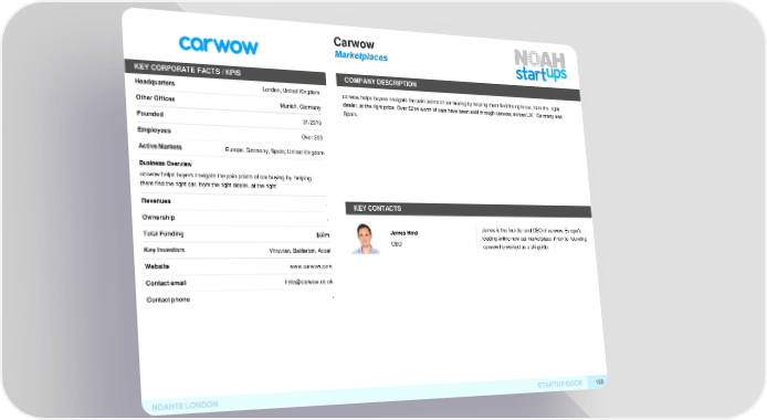 Carwow Marketplaces KEY CORPORATE FACTS /KPIS COMPANYDESCRIPTION Headquarters London, United Kingdomcarwow helps buyers navigate the pain points of car buying by helping them find the right car, from the right OtherOffices Munich, Germany dealer, at the right price. Over £2bn worth of cars have been sold through carwow, across UK, Germany and Spain. Founded 01/2015 Employees Over 200 ActiveMarkets Europe, Germany, Spain, United Kingdom Business Overview carwow helps buyers navigate the pain points of car buying by helping them find the right car, from the right dealer, at the right Revenues - KEYCONTACTS Ownership - TotalFunding James Hind James is the founder and CEO of carwow, Europe's $60m leading online new car marketplace. Prioir to founding KeyInvestors CEO carwow he worked as a ski guide. Vitruvian, Balderton, Accel Website www.carwow.com Contactemail [email protected] Contactphone - NOAH18LONDON STARTUPBOOK 100