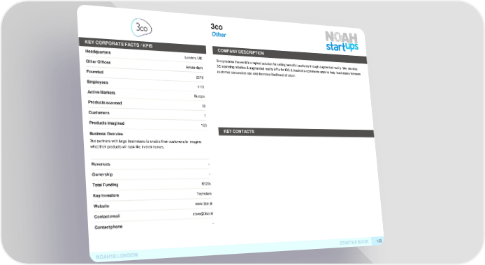 3co Other KEY CORPORATE FACTS /KPIS COMPANYDESCRIPTION Headquarters London, UK 3co provides the world’s simplest solution for selling beautiful products through augmented reality. We develop OtherOffices Amsterdam 3D scanning robotics & augmented reality APIs for iOS & Android e-commerce apps to help businesses increase customer conversion rate and decrease likelihood of return. Founded 2018 Employees 4-10 ActiveMarkets Europe Productsscanned 10 Customers 1 Productsimagined 100 KEYCONTACTS Business Overview 3co partners with large businesses to enable their customers to imagine what their products will look like in their homes. Revenues - Ownership - TotalFunding €120k KeyInvestors Techstars Website www.3co.ai Contactemail [email protected] Contactphone - NOAH18LONDON STARTUPBOOK 133