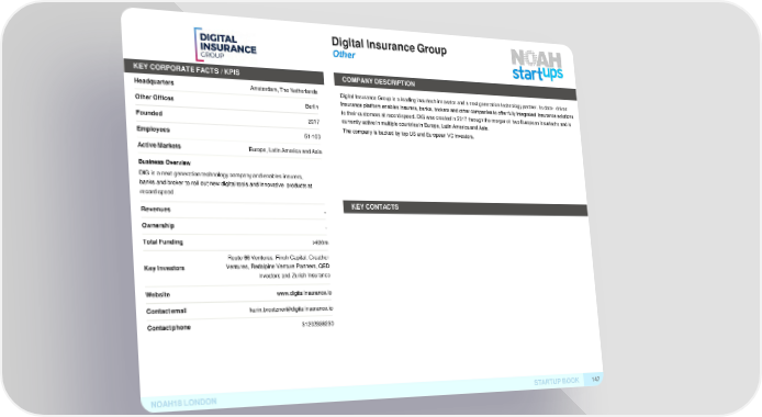 Digital InsuranceGroup Other KEY CORPORATE FACTS /KPIS COMPANYDESCRIPTION Headquarters Amsterdam, The NetherlandsDigital Insurance Group is a leading insurtech innovator and a next generation technology partner. Its data- driven OtherOffices Berlin insurance platform enables insurers, banks, brokers and other companies to offer fully integrated insurance solutions to their customers at record speed. DIG was created in 2017 through the merger of two European insurtechs and is Founded 2017 currently active in multiple countries in Europe, Latin America and Asia. The company is backed by top US and European VC investors. Employees 51-100 ActiveMarkets Europe, Latin America and Asia Business Overview DIG is a next generation technology company and enables insurers, banks and broker to roll out new digital tools and innovative products at record speed. Revenues - KEYCONTACTS Ownership - TotalFunding >€20m Route 66 Ventures, Finch Capital, Creathor KeyInvestors Ventures, Redalpine Venture Partners, QED Investors and Zurich Insurance Website www.digitalinsurance.io Contactemail [email protected] Contactphone 31202338230 NOAH18LONDON STARTUPBOOK 147