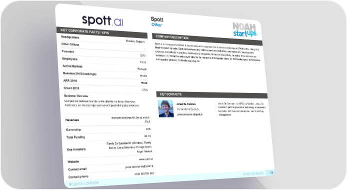 Spott Other KEY CORPORATE FACTS /KPIS COMPANYDESCRIPTION Headquarters Brussels, BelgiumSpott.ai is a successful adtech & ecommerce scale-up present on 3 continents (Europe, LATAM & US). Using AI & OtherOffices - Machine learning tools, Spott.ai transforms any video content into inspiration, and makes any visual content (pictures and videos) interactive, marketable & shoppable. Within the interactivity, the below three services are available: (1) Interactive web-player plug-ins for interactive & shoppable videos (2) Embedded spots, for interactive Founded 2015 & shoppable pictures. (3) Mobile app plug-ins Employees 10-25 ActiveMarkets Portugal Revenue 2018(bookings) €1.5m ARR2018 €650k Churn2018 <75% KEYCONTACTS Business Overview Competition between brands to win attention is fiercer than ever. Audiences are increasingly reached with pushed digital promotions.Jonas De Cooman Jonas De Cooman - co-CEO, co-founder - Jonas De Co-founder & Co-CEO Cooman’s path to grow into a technology entrepreneur has taken him from bio laboratories over marketing jonas.decooman@spott.ai expected bookings €1.5m by end of management Revenues 2018 Ownership 42% TotalFunding €3.1m Family De Spoelberch (AB Inbev), Family KeyInvestors Boone (Lotus Bakeries), Chicago Booth Angel Network Website www.spott.ai Contactemail jonas.decooman@spott.ai Contactphone 0032 498 586 680 NOAH18LONDON STARTUPBOOK 179