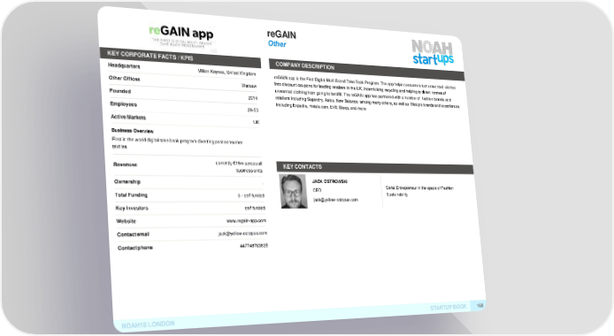 reGAIN Other KEY CORPORATE FACTS /KPIS COMPANYDESCRIPTION Headquarters Milton Keynes, United KingdomreGAIN app is the First Digital Multi Brand Take Back Program. The app helps consumers turn unwanted clothes OtherOffices Warsaw into discount coupons for leading retailers in the UK, incentivising recycling and helping to divert tonnes of unwanted clothing from going to landfill. The reGAIN app has partnered with a number of fashion brands and Founded 2014 retailers including Superdry, Asics, New Balance, among many others, as well as lifestyle brands and experiences including Expedia, Hotels.com, EVE Sleep, and more Employees 26-50 ActiveMarkets UK Business Overview First in the world digital take back program diverting post consumer textiles Revenues currently €15m across allKEYCONTACTS business units Ownership - JACK OSTROWSKI CEO Serial Entrepreneur in the space of Fashion TotalFunding 0 - self funded Sustainability [email protected] KeyInvestors self funded Website www.regain-app.com Contactemail [email protected] Contactphone 447748783635 NOAH18LONDON STARTUPBOOK 168