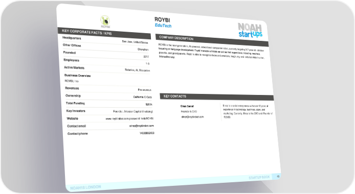 ROYBI EduTech KEY CORPORATE FACTS /KPIS COMPANYDESCRIPTION Headquarters San Jose, United StatesROYBI is the next-generation, AI-powered, educational companion robot, currently targeting 3-7-year-old children OtherOffices Shenzhen focusing on language development. Roybi interacts with kids as well as their supervisors, including teachers, parents, and grandparents. Roybi is able to recognize faces and emotions, laugh, cry, and entertain kids in a fun, Founded 2017 interactive way. Employees 1-3 ActiveMarkets Robotics, AI, Education BusinessOverview ROYBI, Inc Revenues Pre-revenue Ownership California C CorpKEYCONTACTS TotalFunding $200k Elnaz Sarraf Elnaz is a serial entrepreneur with over 12 years of KeyInvestors Founder, Artesian Capital (finalizing)Founder & CEO experience in technology, business, sales, and marketing. Currently, Elnaz is the CEO and Founder of Website www.roybirobot.com password: helloROYBI [email protected] ROYBI Contactemail [email protected] Contactphone 14088882439 NOAH18LONDON STARTUPBOOK 45
