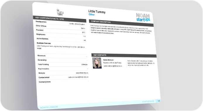 Little Tummy Other KEY CORPORATE FACTS /KPIS COMPANYDESCRIPTION Headquarters London, United KingdomLittle Tummy is the first digital vertical children's food brand in Europe. We deliver fresh, organic baby foods OtherOffices Berlin straight to parent's doorstep, making life a bit easier. Using HPP (High-Pressure-Processing) allows us to produce healthier foods for little ones. Opposed to common, heat-treated baby foods we can keep all essential vitamins Founded 2017 and natural tastes of our products intact. Employees 1-3 ActiveMarkets UK Business Overview Little Tummy sells fresh, organic baby food through an online subscription model. Revenues - KEYCONTACTS Ownership - Nadine Hellmann Nadine founded Little Tummy last year in London, TotalFunding Founder & CEO of Little Tummybelieving that fresh foods and healthy habits are one GBP600k nadine.hellmann@littletummy.coof the most important foundations for life. KeyInvestors - Website www.littletummy.co Contactemail nadine.hellmann@littletummy.co Contactphone - NOAH18LONDON STARTUPBOOK 158