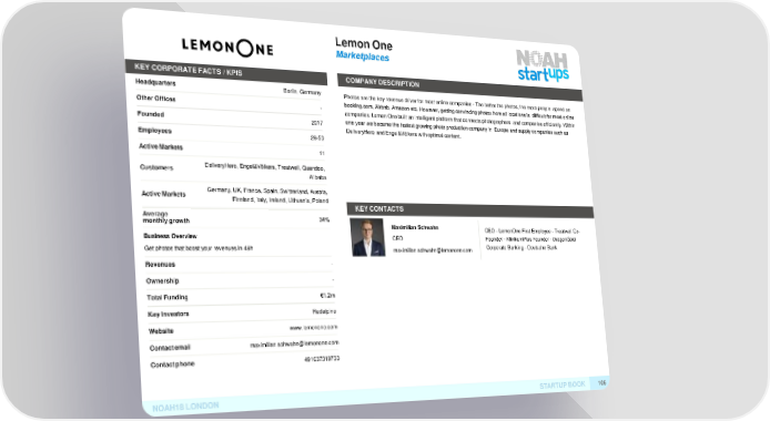 LemonOne Marketplaces KEY CORPORATE FACTS /KPIS COMPANYDESCRIPTION Headquarters Berlin, GermanyPhotos are the key revenue driver for most online companies - The better the photos, the more people spend on OtherOffices - booking.com, Airbnb, Amazon etc. However, getting convincing photos from all locations is difficult for most online companies. Lemon One built an intelligent platform that connects photographers and companies efficiently. Within Founded 2017 one year we became the fastest growing photo production company in Europe and supply companies such as DeliveryHero and Engel&Völkers with optimal content. Employees 26-50 ActiveMarkets 11 Customers DeliveryHero, Engel&Völkers, Treatwell, Quandoo, Alibaba ActiveMarkets Germany, UK, France, Spain, Switzerland, Austria, Finnland, Italy, Ireland, Lithuania, Poland KEYCONTACTS Average 34% monthlygrowth Maximilian Schwahn CEO - LemonOne First Employee - Treatwell Co- Business Overview CEO Founder - KlinikumPlus Founder - DragonGold Get photos that boost your revenues in 48h maximilian.schwahn@lemonone.comCorporate Banking - Deutsche Bank Revenues - Ownership - TotalFunding €1.2m KeyInvestors Redalpine Website www.lemonone.com Contactemail maximilian.schwahn@lemonone.com Contactphone 491637319733 NOAH18LONDON STARTUPBOOK 106