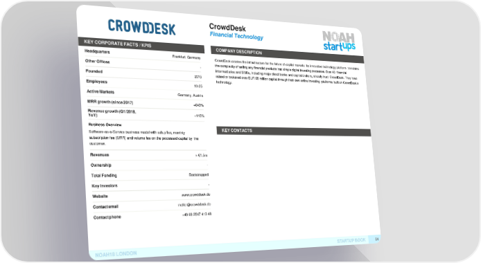 CrowdDesk Financial Technology KEY CORPORATE FACTS /KPIS COMPANYDESCRIPTION Headquarters Frankfurt, GermanyCrowdDesk creates the infrastructure for the future of capital markets. Its innovative technology platform translates OtherOffices - the complexity of selling any financial products into simple digital investing processes. Over 40 financial intermediaries and SMEs, including major direct banks and capital brokers, already trust CrowdDesk. They have Founded 2015 raised or brokered over EUR 65 million capital through their own online investing platforms, built on CrowdDesk's technology. Employees 10-25 ActiveMarkets Germany, Austria MRR growth (since2017) +640% Revenue growth(Q1/2018, +115% YoY) Business Overview KEYCONTACTS Software-as-a-Service business model with setup fee, monthly subscription fee (MRR) and volume fee on the processed capital by the customer. Revenues > €1.5m Ownership - TotalFunding Bootstrapped KeyInvestors - Website www.crowddesk.de Contactemail meller@crowddesk.de Contactphone +49 69 2547 413 48 NOAH18LONDON STARTUPBOOK 54