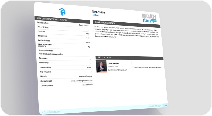 Neadvice Other KEY CORPORATE FACTS /KPIS COMPANYDESCRIPTION Headquarters Espoo, Finland Neadvice was founded with flaming desire to make every business meeting better. We want to take away all the OtherOffices - extra effort and give you Nea, the AI assistant who will take care of every small detail in business meetings. In our minds, the business meeting starts when you are about to find the best possible meeting time and ends when the Founded 2017 guest and host are safely back home. All that happens between is our core intelligence. Nea will handle all your tiny tasks from scheduling to finding BI. Employees 4-10 ActiveMarkets Suomi User growthper 10 month% Business Overview AI to help every business meeting Revenues - KEYCONTACTS Ownership - Topias Nurminen TotalFunding Founder & CEO Topias is a talented founder and inspirational leader. €170k KeyInvestors topias.nurminen@neadvice.com - Website www.neadvice.com/ Contactemail topias.nurminen@neadvice.com Contactphone 358456762692 NOAH18LONDON STARTUPBOOK 162