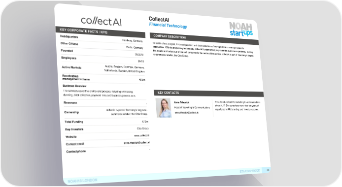 CollectAI FinancialTechnology KEY CORPORATE FACTS /KPIS COMPANYDESCRIPTION Headquarters Hamburg, Germany collectAI offers a digital, AI-based payment and debt collection software platform to manage accounts OtherOffices Berlin, Germany receivables. With its proprietary technology, collectAI fundamentally improves the customer experience, putting the needs and behaviour of the end consumer to the centre of the service. collectAI is part of Germany’s largest Founded 05/2016 e-commerce retailer, the Otto Group. Employees 26-50 ActiveMarkets Austria, Belgium, Denmark, Germany, Netherlands, Sweden, United Kingdom Receivables managementvolume €70m Business Overview The services cover the end-to-end process including e-invoicing, KEYCONTACTS dunning, debt collection, payment links and business process outs Revenues - Anna Friedrich Anna heads collectAI’s marketing & communications Head of Marketing & Communicationssince 2017. She comprises more than ten years of collectAI is part of Germany’s largest e- experience in PR, branding and investor relations. Ownership commerce retailer, the Otto Group. anna.friedrich@collect.ai TotalFunding €10m KeyInvestors Otto Group Website www.collect.ai Contactemail anna.friedrich@collect.ai Contactphone - NOAH18LONDON STARTUPBOOK 53