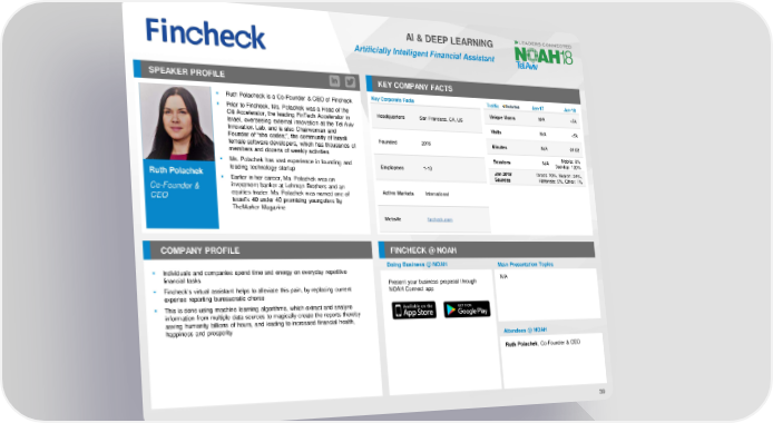 AI & DEEP LEARNING Artificially Intelligent Financial Assistant SPEAKER PROFILE KEY COMPANY FACTS ▪ Ruth Polacheck is a Co-Founder & CEO of Fincheck Key Corporate Facts Traffic Jan-17 Jan-18 ▪ Prior to Fincheck, Ms. Polachek was a Head of the Headquarters San Francisco, CA, US Unique Users N/A <5k Citi Accelerator, the leading FinTech Accelerator in Israel, overseeing external innovation at the Tel Aviv Visits N/A <5k Innovation Lab, and is also Chairwoman and Founder of “she codes;”, the community of Israeli Founded 2016 Minutes N/A 01:02 female software developers, which has thousands of members and dozens of weekly activities Sessions N/A Mobile: 0% ▪ Ms. Polachek has vast experience in founding and Desktop: 100% leading technology startup Employees 1-10 Jan 2018 Direct: 70%, Search: 24%, Ruth Polachek ▪ Earlier in her career, Ms. Polachek was an Sources Referrals: 5%, Other: 1% Co-Founder & investment banker at Lehman Brothers and an Active Markets International CEO equities trader. Ms. Polachek was named one of Israel’s 40 under 40 promising youngsters by TheMarker Magazine Website fincheck.com COMPANY PROFILE FINCHECK @ NOAH Doing Business @ NOAH Main Presentation Topics ▪ Individuals and companies spend time and energy on everyday repetitive financial tasks Present your business proposal through N/A ▪ Fincheck's virtual assistant helps to alleviate this pain, by replacing current NOAH Connect app expense reporting bureaucratic chores ▪ This is done using machine learning algorithms, which extract and analyze information from multiple data sources to magically create the reports thereby saving humanity billions of hours, and leading to increased financial health, happiness and prosperity Attendees @ NOAH Ruth Polachek, Co-Founder & CEO 39