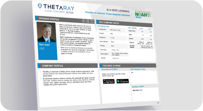 AI & DEEP LEARNING Provider of Unknown Threat Detection Solutions SPEAKER PROFILE KEY COMPANY FACTS ▪ Mark is a prominent senior executive with over 20 Key Corporate Facts Traffic Jan-17 Jan-18 years of experience in leading rapid growth global Headquarters Hod Hasharon, Israel Unique Users <5k <5k organizations, and is an expert authority on Cyber Security, IT, Big Data Analytics, Founded 2013 Visits 5k <5k Telecommunications, Critical Infrastructure and FinTech Employees 51-100 Minutes 03:07 16:21 ▪ Mark’s background is particularly strong in leadership and growth management in global markets, a field in Active Markets Global Sessions Mobile: 0% Mobile: 0% which he built and led multiple companies, helping Desktop: 100% Desktop: 100% them expand globally. His expertise extends to Jan 2018 Direct: 49%, Search: 15%, Mark Gazit building successful management teams Funding $31m Sources Referrals: 29%, Other: 7% CEO ▪ Mark serves on boards of directors in commercial Ownership Private – VCs enterprises and non-profit organization, and lectures in leading universities and considered to be an GE, Jerusalem Venture Partners, expert in his field Key Investors Bank Hapoalim Website thetaray.com COMPANY PROFILE THETARAY @ NOAH Doing Business @ NOAH Main Presentation Topics ▪ ThetaRay is dedicated to helping clients at large financial organizations, cyber security divisions and critical infrastructure become more resilient and seize Present your business proposal through N/A opportunities NOAH Connect app ▪ Its advanced analytical solutions operate with unprecedented speed, accuracy and scale, enabling clients to manage risk, detect money laundering schemes, uncover fraud, expose bad loans, uncover operational issues and reveal valuable new growth opportunities Attendees @ NOAH Mark Gazit, CEO 82
