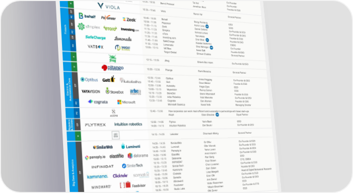 MAIN STAGE - Day 1 13 March 2018 COMPANY TIME COMPANY / SESSION TITLE SPEAKER POSITION 9:00 - 10:00 Breakfast 9:30 - 9:35 Welcome Note K NOAH Advisors Marco Rodzynek Founder & CEO ® FC 9:35 - 9:45 AppCard Yair Goldfinger MR Co-Founder & CEO K 9:45 - 9:55 Venture Capital Enviroment in Europe, Israel and US Vintage Investment Partners Abe Finkelstein General Partner 9:55 - 10:05 Colu Amos Meiri CEO CP 10:05 - 10:15 Bancor Eyal Hertzog Co-Founder Crypto 10:15 - 10:25 Orbs Tal Kol Co-Founder Currencies 10:25 - 10:35 Barrel Protocol Jonathan Meiri Founder & CEO K 10:35 - 10:45 Viola Ronen Nir General Partner CP 10:45 - 10:55 Behalf Benjy Feinberg CEO FC 10:55 - 11:05 Payoneer Keren Levy MR COO 11:05 - 11:15 Zeek Daniel Zelkind Co-Founder & CEO CP 11:15 - 11:25 Simplex Nimrod Lehavi Co-Founder & CEO 11:25 - 11:35 eToro Yoni Assia Founder & CEO Fintech FC 11:35 - 11:45 Investing.com Dror Efrat MR Founder & CEO CP 11:45 - 11:55 SafeCharge Nicolas Vedrenne CBDO 11:55 - 12:05 Lemonade Shai Wininger MR Co-Founder FC 12:05 - 12:15 VATBox Isaac Saft Founder & CEO Target Global Shmuel Chafets General Partner K 12:15 - 12:25 Jfrog Shlomi Ben Haim Co-Founder & CEO K 12:25 - 12:35 Pitango Rami Beracha General Partner 12:35 - 12:45 Optibus Amos Haggiag Co-Founder & CEO 12:45 - 12:55 Gett Dave Waiser Founder & CEO CP 12:55 - 13:05 Autotalks Hagai Zyss CEO 13:05 - 13:15 Vayavision Ronny Cohen CEO Electric & 13:15 - 13:25 StoreDot Doron Myersdorf Founder & CEO 13:25 - 13:35 Arbe Robotics Kobi Marenko Co-Founder & CEO Autonomous CarsFC 13:35 - 13:45 Cognata Dan Atsmon Founder & CEO Microsoft ScaleUp Navot Volk Managing Director FC 13:45 - 13:55 How corporates can work most efficient and successful in partnerships with Israel start-ups Aleph Eden Shochat MR Equal Partner CP 13:55 - 14:05 Flytrex Yariv Bash CEO Robotics& Drones 14:05 - 14:15 Intuition Robotics Dor Skuler Co-Founder & CEO K 14:15 - 14:25 Lakestar Dharmash Mistry General Partner 14:25 - 14:35 SimilarWeb Or Offer Co-Founder & CEO 14:35 - 14:45 Luminati Ofer Vilenski Co-Founder & CEO 14:45 - 14:55 Panoply.io Yaniv Leven Co-Founder & CEO 14:55 - 15:05 Elastifile Amir Aharoni Co-Founder & CEO 15:05 - 15:15 Datorama Ran Sarig CEO 15:15 - 15:25 INFINIDAT Eran Brown CTO, EMEA AnalyticsCP 15:25 - 15:35 SimilarTech Chen Levanon Co-Founder & CEO 15:35 - 15:45 Kaminario Dani Golan Founder & CEO 15:45 - 15:55 Clicktale Liraz Margalit Head of Digital Behavioral Research Big Data & 15:55 - 16:05 Somatix Eran Ofir Co-Founder & CEO 16:05 - 16:15 Windward Ami Daniel Co-Founder & CEO 16:15 - 16:25 Feedvisor Victor Rosenman CEO 16:25 - 16:35 Redis Labs Yiftach Shoolman Co-Founder & CTO 16:35 - 16:45 Cellwize Ofir Zemer CEO FC 16:45 - 16:55 AppsFlyer Oren Kaniel MR Co-Founder & CEO 16:55 - 17:05 MyHeritage Gilad Japhet Founder & CEO 17:05 - 17:15 Wix.com Reuven J. Sherwin VP Product 17:15 - 17:25 TIPA Daphna Nissenbaum Co-Founder & CEO 17:25 - 17:35 SeekingAlpha Eli Hoffmann CEO & Editor-in-Chief CP 17:35 - 17:45 Wizer.Me Nira Mayorchik Sheleg Co-Founder & CEO User Paid & B2B Services 17:45 - 17:55 Missbeez Gil Bouhnick Co-Founder & CTO 17:55 - 18:05 Bringg Raanan Cohen Co-Founder & CEO 18:05 - 18:15 Stratoscale Ariel Maislos Founder & CEO 18:15 - 18:25 Stargo Joel Sellam Founder & CEO 18:25 - 18:35 hibob Ronni Zehavi Co-Founder & CEO K 18:35 - 18:40 Closing Note ® NOAH Advisors Marco Rodzynek Founder & CEO 18:40 Networking Reception Lunch served between 12:30 - 14:30 CP Company Presentation K Keynote FC Fireside Chat MR Interview / Panel with participation of Marco Rodzynek Founder & CEO, NOAH Advisors 6