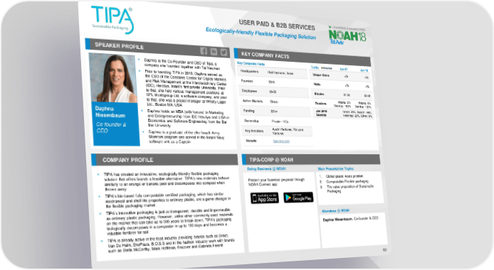 USER PAID & B2B SERVICES Ecologically-friendly Flexible Packaging Solution SPEAKER PROFILE KEY COMPANY FACTS ▪ Daphna is the Co-Founder and CEO of Tipa, a Key Corporate Facts Traffic Jan-17 Jan-18 company she founded together with Tal Neuman Headquarters Hod-Hasharon, Israel Unique Users <5k <5k ▪ Prior to founding TIPA in 2010, Daphna served as the CEO of the Caesarea Center for Capital Markets Founded 2010 Visits <5k <5k and Risk Management at the Interdisciplinary Center (IDC), Herzliya, Israel’s first private University. Prior Employees 26-50 Minutes 01:26 02:48 to that, she held various management positions at SPL Worldgroup Ltd, a software company, and prior Active Markets Global Sessions Mobile: 0% Mobile: 0% to that, she was a project manager at Whelty Lager Desktop: 100% Desktop: 100% Ltd., Boston MA, USA Funding $21m Jan 2018 Direct: 23%, Search: 46%, Daphna ▪ Daphna holds an MBA (with honors) in Marketing Sources Referrals: 23%, Other: 8% Nissenbaum and Entrepreneurship from IDC Herzliya and a BA in Ownership Private – VCs Economics and Software Engineering from the Bar Co-founder & Ilan University Austin Ventures, Horizons CEO ▪ Daphna is a graduate of the elite Israeli Army Key Investors Ventures Mamramprogram and served in the Israeli Navy Website tipa-corp.com software unit as a Captain COMPANY PROFILE TIPA-CORP @ NOAH Doing Business @ NOAH Main Presentation Topics ▪ TIPA has created an innovative, ecologically-friendly flexible packaging solution that offers brands a feasible alternative. TIPA's new materials behave Present your business proposal through 1. Global plastic waste problem similarly to an orange or banana peel and decomposes into compost when NOAH Connect app 2. Compostable Flexible packaging thrown away 3. The value proposition of Sustainable ▪ TIPA’s bio-based fully compostable certified packaging, which has similar Packaging mechanical and shelf-life properties to ordinary plastic, are a game changer in the flexible packaging market ▪ TIPA’s innovative packaging is just as transparent, durable and impermeable as ordinary plastic packaging. However, unlike other commonly used materials Attendees @ NOAH on the market that can take up to 500 years to break down, TIPA's packaging biologically decomposes in a composter in up to 180 days and becomes a Daphna Nissenbaum, Co-founder & CEO valuable fertilizer for soil ▪ TIPA is already active in the food industry providing brands such as Snact, Van De Halm, EkoPlaza, B.O.S.S and in the fashion industry work with brands such as Stella McCarthy, Mara Hoffman, Recover and Gabriela Hearst 83