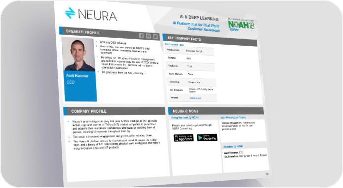 AI & DEEP LEARNING AI Platform that for Real World Customer Awareness SPEAKER PROFILE KEY COMPANY FACTS ▪ Amit is a CEO at Neura Key Corporate Facts ▪ Prior to that, Hammer served as Neura’s chief Headquarters Sunnyvale, CA, US operating officer, overseeing business and operations Founded 2013 ▪ He brings over 20 years of business management and technical experience to the role of CEO. While at Employees 11-50 Texas Instruments Inc., Hammer led multiple IoT connectivity businesses ▪ He graduated from Tel Aviv University Active Markets Global Amit Hammer CEO Ownership Private – VCs Key Investors Pitango, AXA, Liberty Media, Lenovo Website theneura.com COMPANY PROFILE NEURA @ NOAH Doing Business @ NOAH Main Presentation Topics ▪ Neura is a technology company that uses Artificial Intelligence (AI) to enable mobile apps and Internet of Things (IoT) product companies to personalize Present your business proposal through Increase engagement, retention and conversion based on real life user and adapt to their customers’ preferences and needs by reaching them at NOAH Connect app precise, meaningful moments throughout their day personalization ▪ The result is increased engagement and growth, while reducing churn ▪ The Neura AI platform utilizes its sophisticated hybrid AI engine, its mobile SDK, and a library of API calls to bring physical world intelligence into today’s most innovative apps and IoT products Attendees @ NOAH Amit Hammer, CEO Ori Shaashua, Co-Founder & Head of Product 58