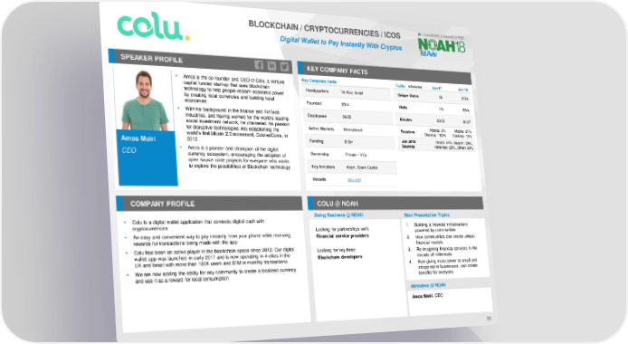 BLOCKCHAIN / CRYPTOCURRENCIES / ICOS Digital Wallet to Pay Instantly With Cryptos SPEAKER PROFILE KEY COMPANY FACTS ▪ Amos is the co-founder and CEO of Colu, a venture Key Corporate Facts Traffic Jan-17 Jan-18 capital funded start-up that uses blockchain Headquarters Tel Aviv, Israel Unique Users 6k 212k technology to help people reclaim economic power by creating local currencies and building local Founded 2014 Visits 11k 654k economies ▪ With his background in the finance and FinTech Employees 26-50 Minutes 03:55 00:37 industries, and having worked for the world's leading social investment network, he channeled his passion Active Markets International Sessions Mobile: 0% Mobile: 87% for disruptive technologies into establishing the Desktop: 100% Desktop: 13% world’s first bitcoin 2.0 movement, ColoredCoins, in Funding $12m Jan 2018 Direct: 24%, Search: 23%, Amos Meiri 2012 Sources Referrals: 23%, Other: 30% CEO ▪ Amos is a pioneer and champion of the digital Ownership Private – VCs currency ecosystem, encouraging the adoption of open source code projects for everyone who wants to explore the possibilities of Blockchain technology Key Investors Aleph, Spark Capital Website colu.com COMPANY PROFILE COLU @ NOAH Doing Business @ NOAH Main Presentation Topics ▪ Colu is a digital wallet application that connects digital cash with cryptocurrencies Looking for partnerships with: 1. Building a financial infrastructure ▪ An easy and convenient way to pay instantly from your phone while receiving Financial service providers powered by communities rewards for transactions being made with the app 2. How communities can create unique ▪ Colu has been an active player in the blockchain space since 2012. Our digital financial models wallet app was launched in early 2017 and is now operating in 4 cities in the Looking for key hires: 3. Re imagining financial services in the UK and Israel with more than 100K users and $1M in monthly transactions Blockchain developers decade of millennials ▪ We are now adding the ability for any community to create a localized currency 4. How giving more power to small and and use it as a reward for local consumption independent businesses, can create benefits for everyone Attendees @NOAH Amos Meiri, CEO 31