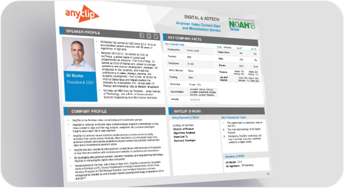 DIGITAL & ADTECH AI-driven Video Content Data and Monetization Service SPEAKER PROFILE KEY COMPANY FACTS ▪ Gil Becker has served as CEO since 2015. He is an Key Corporate Facts Traffic Jan-17 Jan-18 accomplished adtech executive with 20 years of Headquarters Tel Aviv, Israel Unique Users 58k 32k experience in high tech ▪ Between 2012-2015, Gil served as COO at Founded 2008 Visits 156k 85k myThings, a global leader in customized programmatic ad solutions. Prior to myThings, Gil Employees 51-100 Minutes 00:47 03:42 served as COO of Market.com, where he oversaw operations and product development, managed 120 Active Markets Global Sessions Mobile: 70% Mobile: 89% employees in four countries, and made key Desktop: 30% Desktop: 11% contributions to sales, strategic planning, and Funding $24m Jan 2018 Direct: 20%, Search: 35%, Gil Becker business development. Prior to that, he served as Sources Referrals: 17%, Other: 28% COO at Safecharge and helped position the President & CEO company for a successful IPO. He also held VP Ownership Private – VCs Product and Marketing roles at Metalink Broadband Jerusalem Venture Partners, ▪ Gil holds an MBA from the Technion – Israel Institute Key Investors Ervington Investments, Michael of Technology, and a B.Sc. in Communication Schulhof, Limelight Networks Systems Engineering from Ben-Gurion University Website anyclip.com COMPANY PROFILE ANYCLIP @ NOAH ▪ AnyClip is the AI-driven video content data and monetization pioneer Doing Business @ NOAH Main Presentation Topics ▪ AnyClip’s Luminous is the first video content analysis engine to automatically cut any Looking for key hires: 1. The urgent need to understand video in video content to clips and then tag, analyze, categorize, and produce meaningful Director of Product real-time insights about each clip in near-real-time 2. The main shortcomings of the Digital ▪ AnyClip’s Luminous -based solutions enable premium content owners to safely Algorithms Engineer Duopoly monetize their assets across channels, allow advertisers to contextually target safe, Front-End TL 3. Introducing AnyClip's technology and premium content, and provide publishers relevant content that perfectly matches their Back-end Developer how it can help overcome existential sites and is monetized at premium prices problems in digital media ▪ AnyClip has also curated an ultra-premium content library with hundreds of thousands of clips that are enriched with metadata and available for publishers and advertisers ▪ By leveraging ultra-premium content, real-time metadata, and deep learning technology, AnyClip is reshaping the digital video ecosystem Attendees @ NOAH ▪ Headquartered in Tel Aviv, with offices in New York, AnyClip is backed by Jerusalem Venture Partners (JVP), Roman Abramovich’sErvingtonInvestments, former Sony Gil Becker, CEO America President & CEO Michael Schulhof, and Limelight Networks, and was Ari Applbaum, VP Marketing recognized by Deloitte as one of Israel’s fastest growing technology companies in 2016 and 2017 18