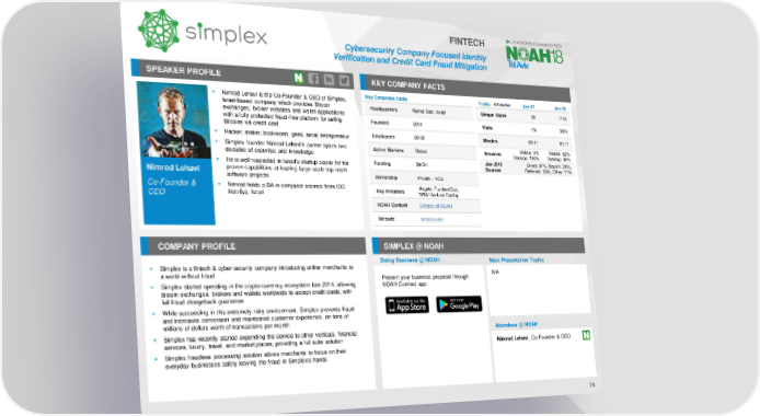 FINTECH Cybersecurity Company Focused Identity Verification and Credit Card Fraud Mitigation SPEAKER PROFILE KEY COMPANY FACTS ▪ Nimrod Lehavi is the Co-Founder & CEO of Simplex, Key Corporate Facts Traffic Jan-17 Jan-18 Israel-based company which provides Bitcoin Headquarters Ramat Gan, Israel Unique Users 8k 114k exchanges, broker websites and wallet applications with a fully protected fraud-free platform for selling Founded 2014 Visits 15k 307k Bitcoins via credit card ▪ Hacker, maker, bookworm, geek, serial entrepreneur Employees 26-50 Minutes 03:11 01:11 ▪ Simplex founder Nimrod Lehavi’s career spans two Active Markets Global Sessions Mobile: 0% Mobile: 62% decades of expertise and knowledge Desktop: 100% Desktop: 38% ▪ He is well-respected in Israel’s startup scene for his Funding $9.5m Jan 2018 Direct: 37%, Search: 29%, Nimrod Lehavi proven capabilities at leading large scale top notch Sources Referrals: 23%, Other: 11% software projects Ownership Private – VCs Co-Founder & ▪ Nimrod holds a BA in computer science from IDC Key Investors iAngels, FundersClub, CEO Herzliya, Israel DRW Venture Capital NOAH Content Simplex at NOAH Website simplex.com COMPANY PROFILE SIMPLEX @ NOAH Doing Business @ NOAH Main Presentation Topics ▪ Simplex is a fintech & cyber-security company introducing online merchants to a world without fraud Present your business proposal through N/A ▪ Simplex started operating in the crypto-currency ecosystem late 2014, allowing NOAH Connect app bitcoin exchanges, brokers and wallets worldwide to accept credit cards, with full fraud chargeback guarantee ▪ While succeeding in this extremely risky environment, Simplex prevents fraud and increases conversion and maintained customer experience, on tens of millions of dollars worth of transactions per month ▪ Simplex has recently started expending the service to other verticals, financial Attendees @ NOAH services, luxury, travel, and market places, providing a full suite solution Nimrod Lehavi, Co-Founder & CEO ▪ Simplex fraudless processing solution allows merchants to focus on their everyday businesses safely leaving the fraud in Simplex's hands 74