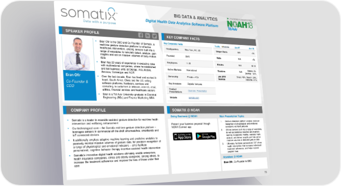 BIG DATA & ANALYTICS Digital Health Data Analytics Software Platform SPEAKER PROFILE KEY COMPANY FACTS ▪ Eran Ofir is the CEO and Co-Founder of Somatix, a Key Corporate Facts Traffic Jan-17 Jan-18 real-time gesture detection platform for effective Headquarters New York, NY, US Unique Users N/A <5k healthcare intervention, utilizing sensors built into a range of wearables to remotely detect, analyze, gain Founded 2015 Visits N/A <5k insights and act on massive volumes of body motion data Employees 11-25 Minutes N/A 02:13 ▪ Eran has 20 years of experience in executive roles with multinational companies, where he established Active Markets International Sessions N/A Mobile: 0% and led business units at Orange, AOL Mobile, Desktop: 100% Amdocs, Convergys and NCR Jan 2018 Direct: 46%, Search: 33%, Eran Ofir ▪ Over the last decade, Eran has lived and worked in Ownership Private – VCs Sources Referrals: 21% Co-Founder & Israel, South Africa, China and the US, selling Key Investors Digitalis Ventures software platforms, hardware, services and CEO consulting to customers in telecom, internet, retail, Product utilities, financial services and healthcare sectors Presentations Overview Presentation ▪ Eran is a Tel-Aviv University graduate in Electrical Engineering (BSc) and Finance-Marketing MBA Website somatix.com COMPANY PROFILE SOMATIX @ NOAH Doing Business @ NOAH Main Presentation Topics ▪ Somatix is a leader in wearable-assisted gesture detection for real-time health intervention and wellbeing enhancement Present your business proposal through 1. Gesture detection platform enables precision ▪ Our technological core – the Somatix real-time gesture detection platform – NOAH Connect app recognition of physiological and emotional leverages sensors in commercial off-the-shelf smartwatches, smartbands and symptoms via hand gestures IoT connected devices 2. Utilizes sensors built into a range of wearables, as well as predictive analytics and machine ▪ It additionally employs adaptive machine learning and predictive analytics to learning to passively monitor, remotely track, passively monitor massive volumes of gesture data, for precision recognition of analyze, and deliver insights and help act on a range of physiological and emotional indicators – all to facilitate massive volumes of detected gesture data personalized, cognitive behavior therapy incentive-assisted health intervention 3. Ultimately facilitates personalized CBT driven health intervention that increases individuals' ▪ Somatix’s innovative digital health solutions ultimately enable enterprises, treatment adherence, and helps improve health insurance companies, clinics and elderly caregivers, among others, to people's lives increase the treatment adherence and improve the lives of those under their Attendees @ NOAH care Eran Ofir, Co-Founder & CEO 75