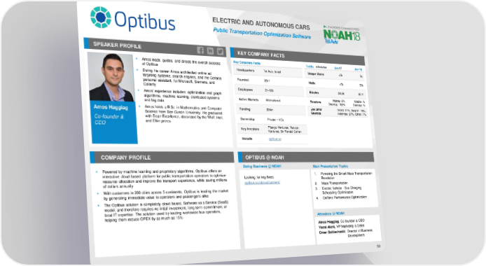 ELECTRIC AND AUTONOMOUS CARS Public Transportation Optimization Software SPEAKER PROFILE KEY COMPANY FACTS ▪ Amos leads, guides, and directs the overall success Key Corporate Facts Traffic Jan-17 Jan-18 of Optibus Headquarters Tel Aviv, Israel Unique Users <5k 5k ▪ During his career Amos architected online ad targeting systems, search engines, and the Cortana Founded 2011 Visits <5k 22k personal assistant, for Microsoft, Siemens, and Collarity Employees 51-100 Minutes 00:39 00:11 ▪ Amos’ experience includes: optimization and graph Mobile: 0% Mobile: % algorithms, machine learning, distributed systems Active Markets International Sessions Desktop: 100% Desktop: % and big data ▪ Amos holds a B.Sc. in Mathematics and Computer Funding $24m Jan 2018 Direct: 51%, Search: 15%, Amos Haggiag Science from Ben-Gurion University. He graduated Sources Referrals: 27%, Other: 7% Co-founder & with Dean Excellence, decorated by the Wolf, Intel, Ownership Private – VCs CEO and Elkin prizes Key Investors Pitango Ventures, Verizon Ventures, Sir Ronald Cohen Website optibus.co COMPANY PROFILE OPTIBUS @ NOAH Doing Business @ NOAH Main Presentation Topics ▪ Powered by machine learning and proprietary algorithms, Optibus offers an interactive cloud-based platform for public transportation operators to optimize Looking for key hires: 1. Powering the Smart Mass Transportation resource allocation and improve the transport experience, while saving millions optibus.co/about/careers/ Revolution of dollars annually 2. Mass Transportation ▪ With customers in 200 cities across 5 continents, Optibus is leading the market 3. Electric Vehicle - Bus Charging by generating immediate value to operators and passengers alike Scheduling Optimization ▪ The Optibus solution is completely cloud based, Software as a Service (SaaS) 4. OnTime Performance Optimization model, and therefore requires no initial investment, long-term commitment, or local IT expertise. The solution used by leading worldwide bus operators, helping them reduce OPEX by as much as 15% Attendees @ NOAH Amos Haggiag, Co-founder & CEO Yossi Aloni, VP Marketing & Sales Omer Goldschmidt, Director of Business Development 59