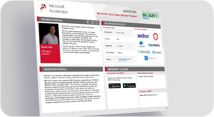 INVESTORS Microsoft’s Early Stage Startups Program SPEAKER PROFILE KEY INVESTORFACTS • Navot Volk is the Managing Director of Microsoft Key Corporate Facts Key Portfolio Companies Accelerator Israel • Navot is a serial entrepreneur, having co-founded Headquarters Tel Aviv, Israel three startups, and has amassed over a decade of software industry and technology experience. He has a track record in managing companies, from Founded 2012 incubation to global sales, and has played an active role in driving forward and developing company strategies and goals Employees 101-1,000 Navot Volk • Navot is also the co-host of Israel’s leading tech podcast, 30 Minutes or Less, which attracts thousands Managing of listeners each week for in-depth conversations with Active Markets National Director some of Israel’s leading tech luminaries Website microsoftaccelerator.com /locations/telaviv INVESTORPROFILE MICROSOFT @ NOAH Doing Business @ NOAH Main Presentation Topics • Microsoft is an American multinational corporation that develops, manufactures, licenses, supports, and sells a range of software products and services Present your business proposal through Fireside chat with Cognata • Microsoft’s devices and consumer (D&C) licensing segment licenses Windows NOAH Connect app operating system and related software; Microsoft Office for consumers; and Windows Phone operating system. The company’s computing and gaming hardware segment provides Xbox gaming and entertainment consoles and accessories, second-party and third-party video games, and Xbox Live subscriptions; surface devices and accessories; and Microsoft PC accessories. Its phone hardware segment offers Lumia smartphones and other non-Lumia Attendees @ NOAH phones. Its D&C other segment provides Windows Store, Xbox Live transactions, and Windows phone store; search advertising; display advertising; Navot Volk, Managing Director Office 365 Home and Office 365 Personal; first-party video games; and other consumer products and services as well as operating retail stores 55