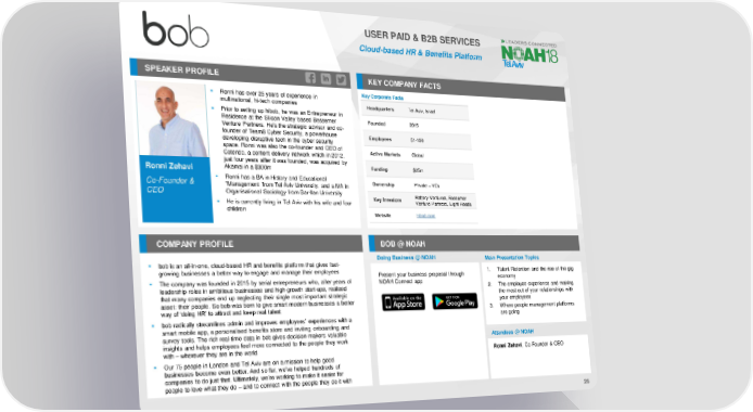 USER PAID & B2B SERVICES Cloud-based HR & Benefits Platform SPEAKER PROFILE KEY COMPANY FACTS ▪ Ronni has over 25 years of experience in Key Corporate Facts multinational, hi-tech companies Headquarters Tel Aviv, Israel ▪ Prior to setting up hibob, he was an Entrepreneur in Residence at the Silicon Valley based Bessemer Founded 2015 Venture Partners. He's the strategic advisor and co- founder of Team8 Cyber Security, a powerhouse Employees 51-100 developing disruptive tech in the cyber security space. Ronni was also the co-founder and CEO of Active Markets Global Cotendo, a content delivery network which in 2012, just four years after it was founded, was acquired by Ronni Zehavi Akamai in a $300m Funding $25m Co-Founder & ▪ Ronni has a BA in History and Educational Ownership Private – VCs "Management 'from Tel Aviv University, and a MA in CEO Organisational Sociology from Bar-Ilan University Battery Ventures, Bessemer ▪ Heis currently living in Tel Aviv with his wife and four Key Investors Venture Partners, Eight Roads children Website hibob.com COMPANY PROFILE BOB @ NOAH Doing Business @ NOAH Main Presentation Topics ▪ bob is an all-in-one, cloud-based HR and benefits platform that gives fast- growing businesses a better way to engage and manage their employees Present your business proposal through 1. Talent Retention and the rise of the gig ▪ The company was founded in 2015 by serial entrepreneurs who, after years of NOAH Connect app economy leadership roles in ambitious businesses and high-growth start-ups, realised 2. The employee experience and making that many companies end up neglecting their single most important strategic the most out of your relationships with asset: their people. So bob was born to give smart modern businesses a better your employees 3. Where people management platforms way of ‘doing HR’ to attract and keep real talent are going ▪ bob radically streamlines admin and improves employees’ experiences with a smart mobile app, a personalised benefits store and inviting onboarding and survey tools. The rich real-time data in bob gives decision-makers valuable Attendees @NOAH insights and helps employees feel more connected to the people they work with – wherever they are in the world Ronni Zehavi, Co-Founder & CEO ▪ Our 75 people in London and Tel Aviv are on a mission to help good businesses become even better. And so far, we’ve helped hundreds of companies to do just that. Ultimately, we’re working to make it easier for people to love what they do – and to connect with the people they do it with 26